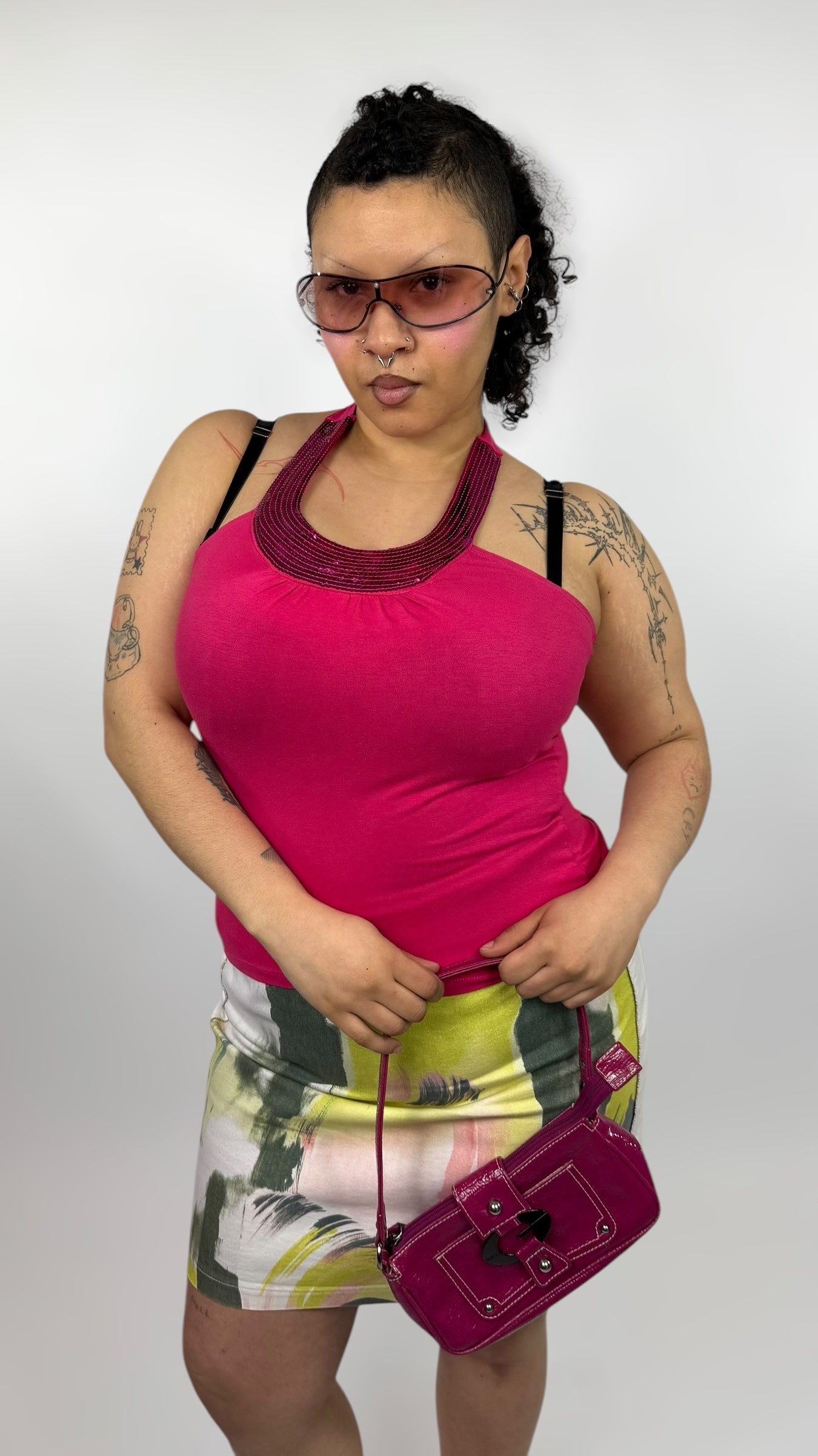 Débardeur rose avec des paillettes roses. Tissu très élastique.