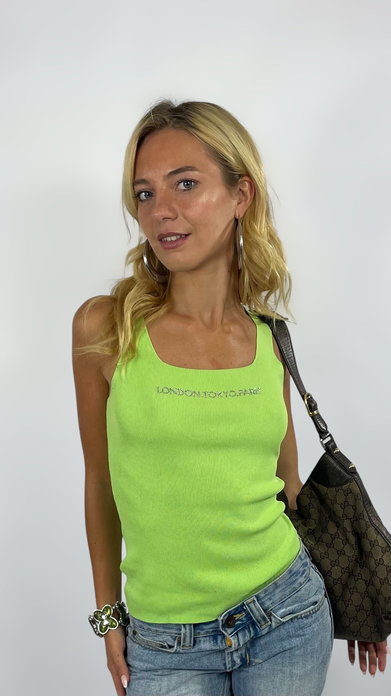Top débardeur vert néon col carré, avec détails strass argenté sur le devant, matière maille extensible.