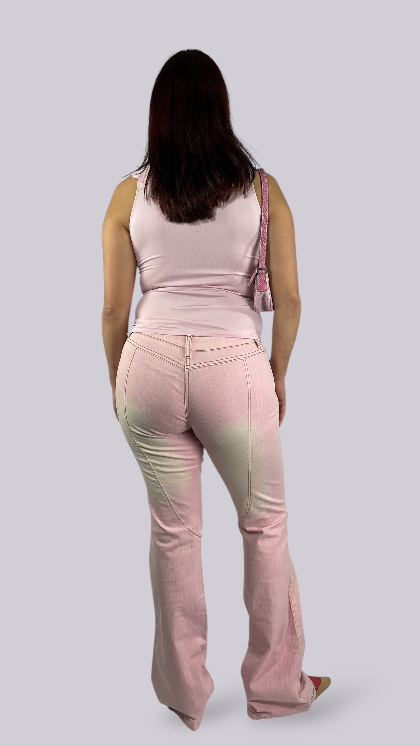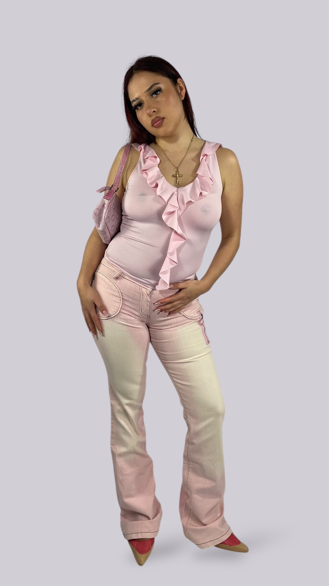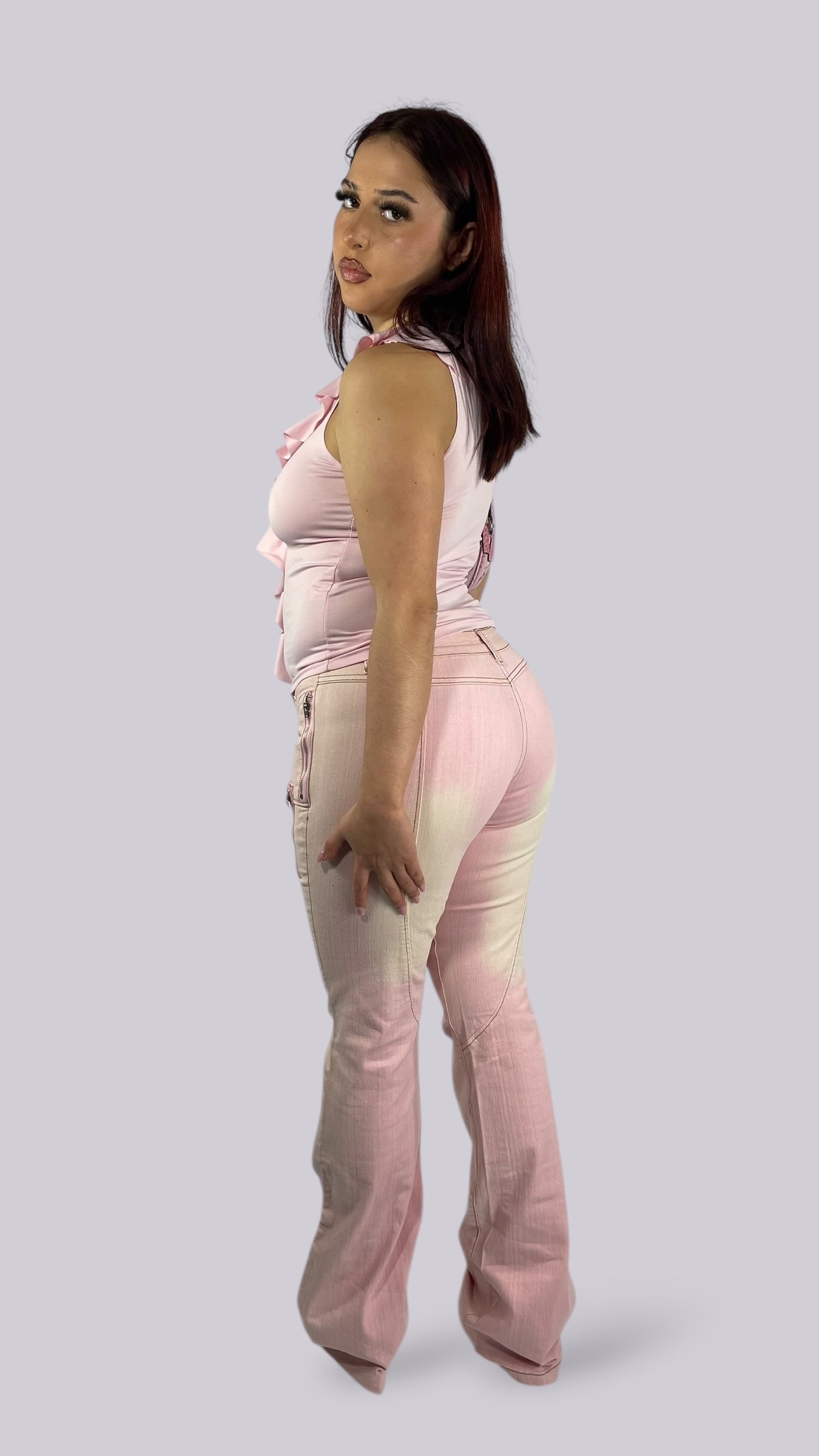 Top rose pâle sans manches décolleté avec des volants. Matière très élastique.