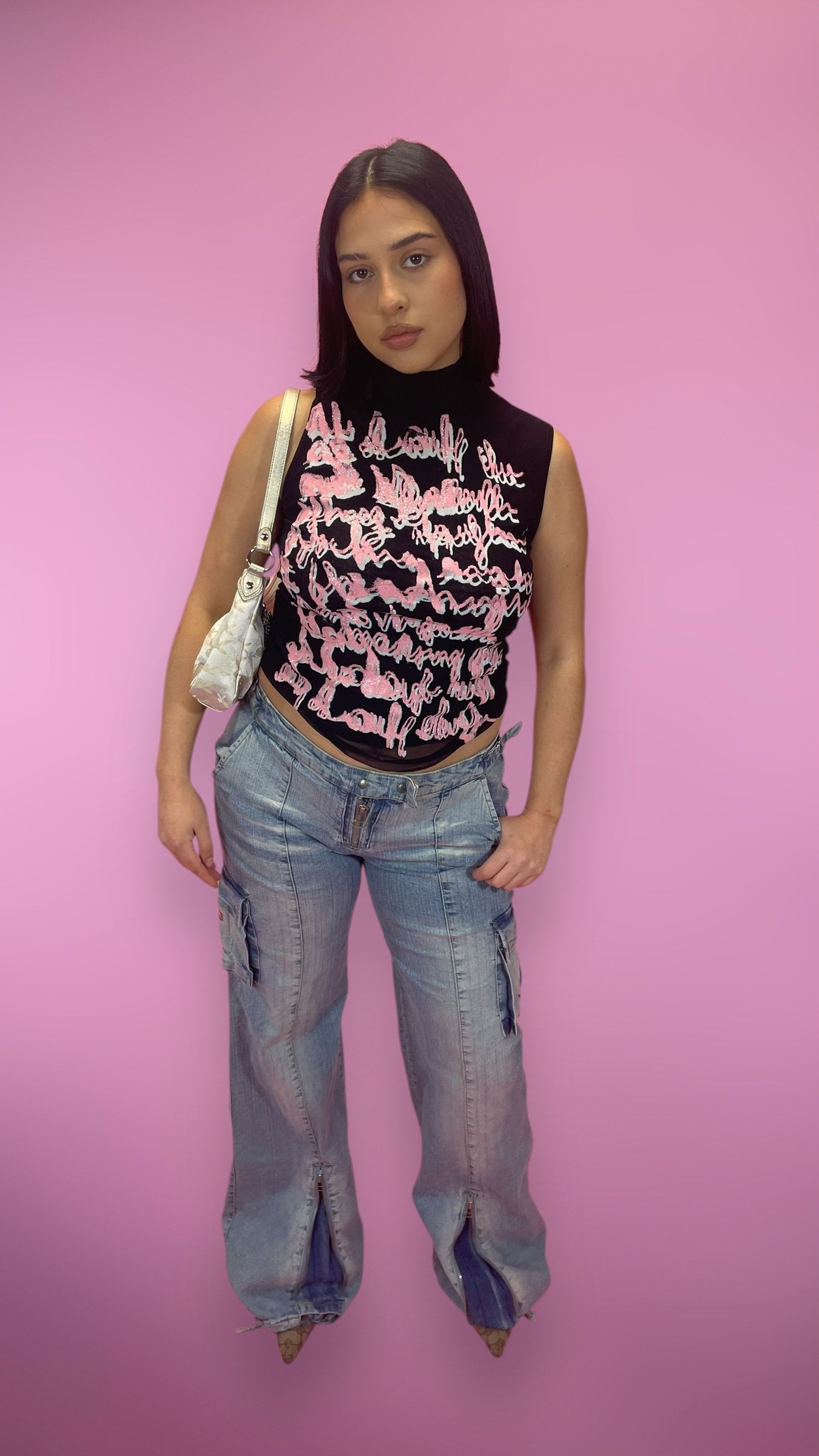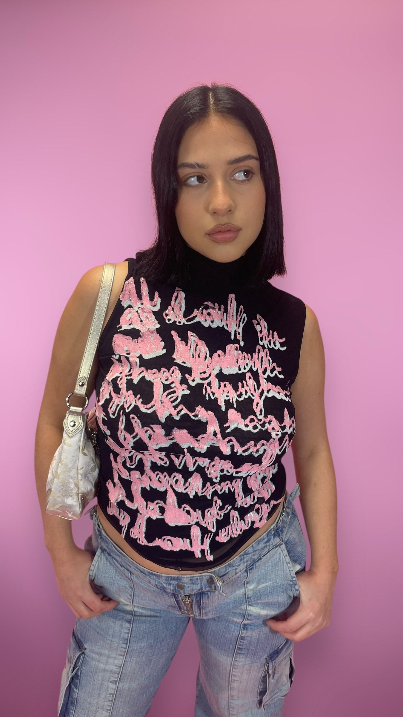 Haut noir et rose col roulé en maille et mesh avec des paillettes.