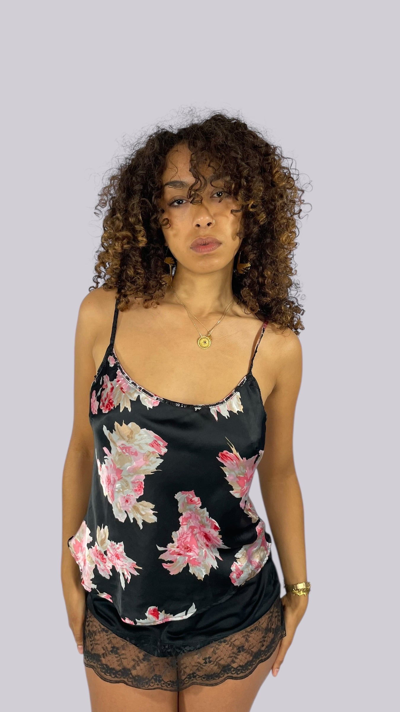 Débardeur noir et rose en satin à motif florale avec des sequins à l’avant.