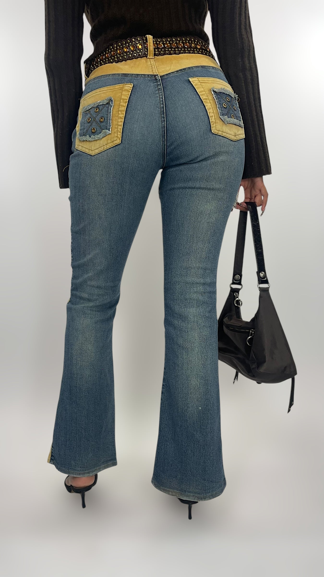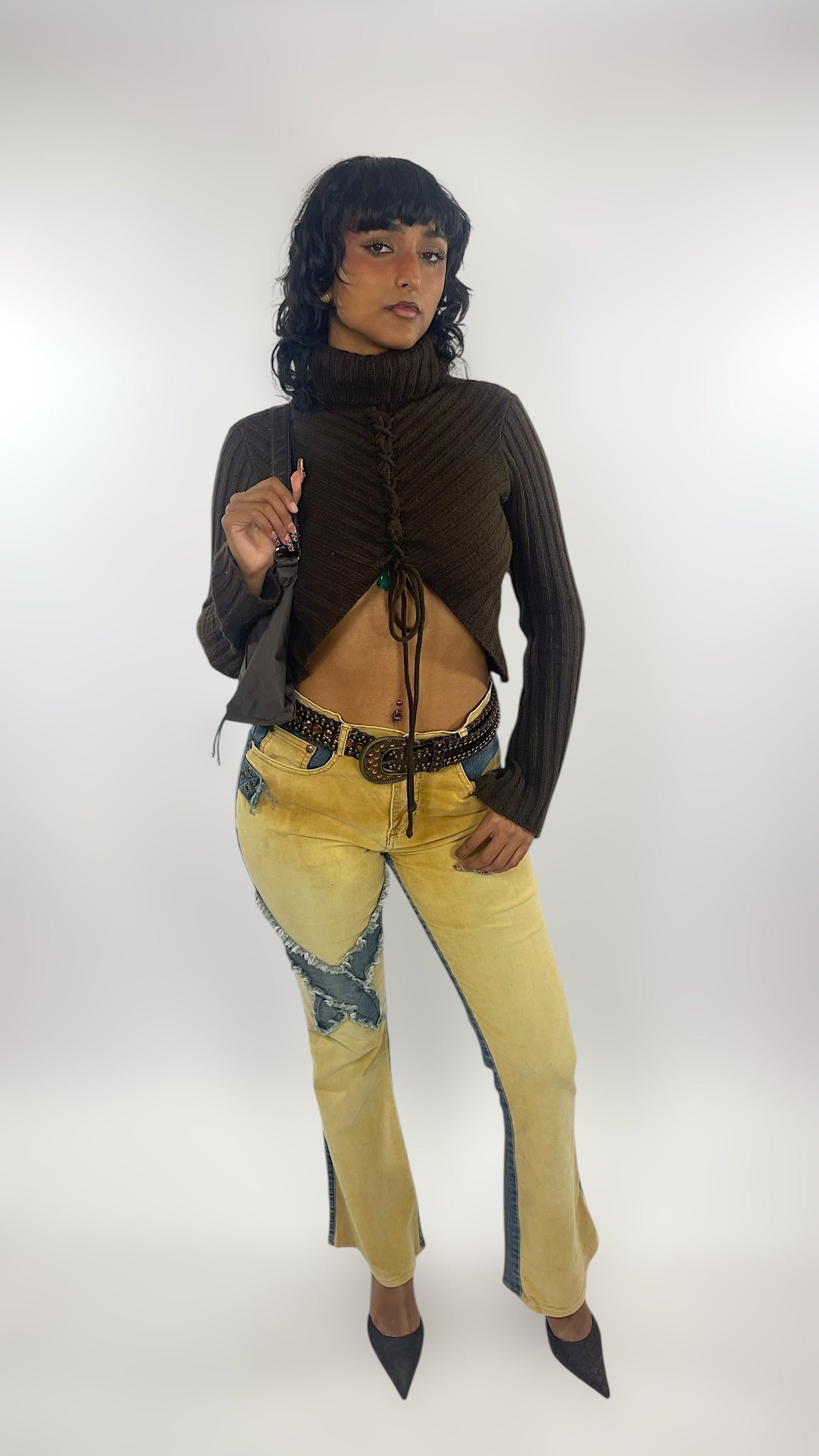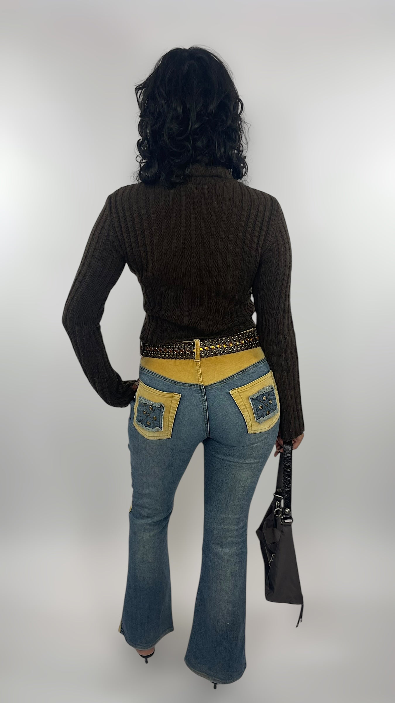 Pantalon bicolore bleu et beige et bi-matière en jean et côtelé coupe évasé. Petit trou dans le passant de la ceinture.