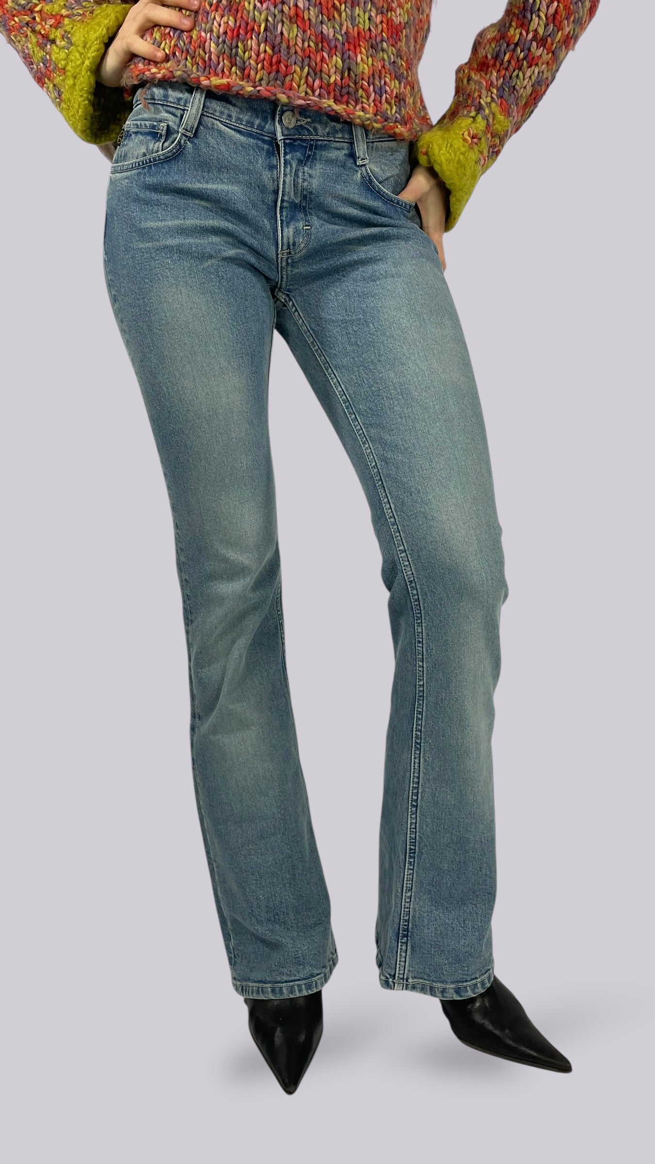 Jean bleu claire délavé taille basse et coupe évasée. Matière très élastique.