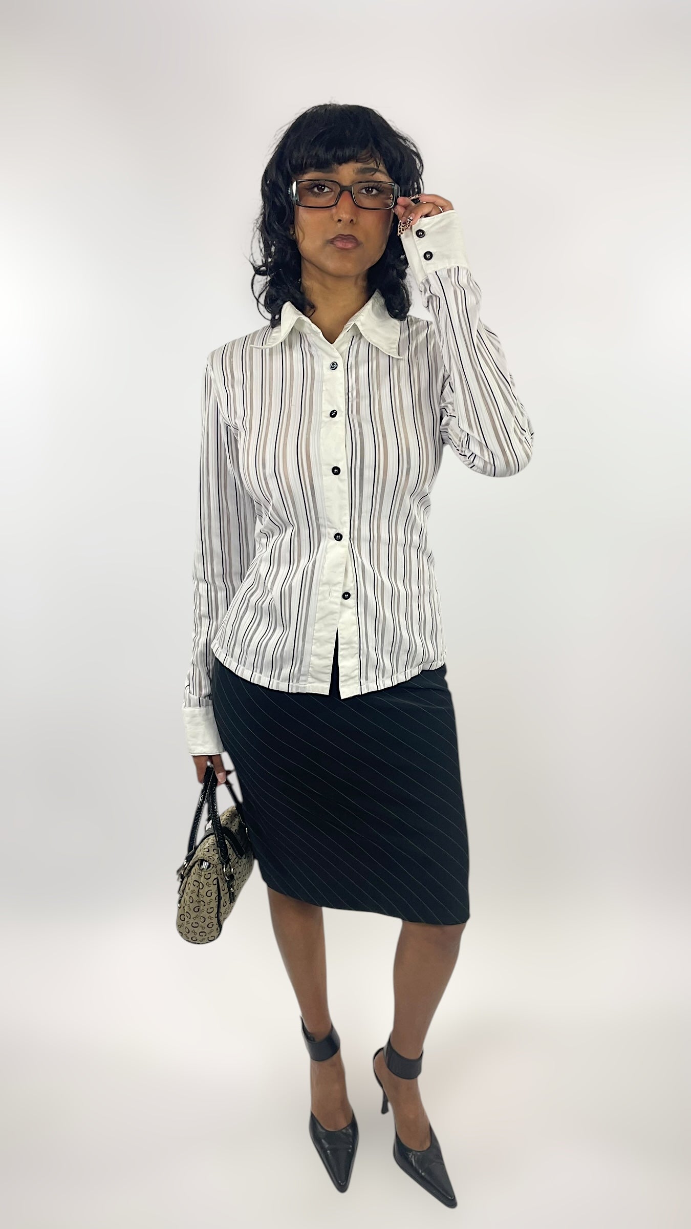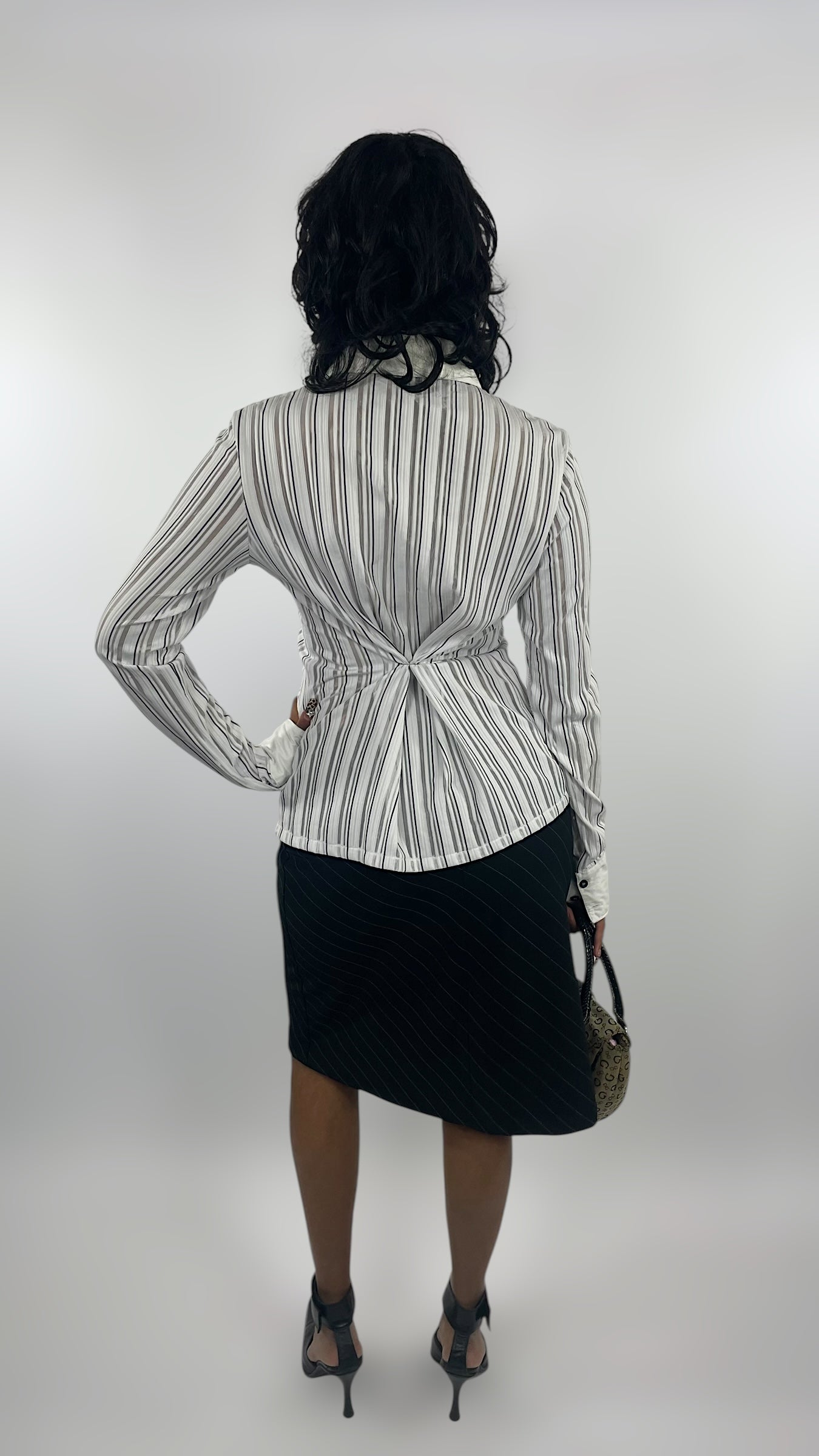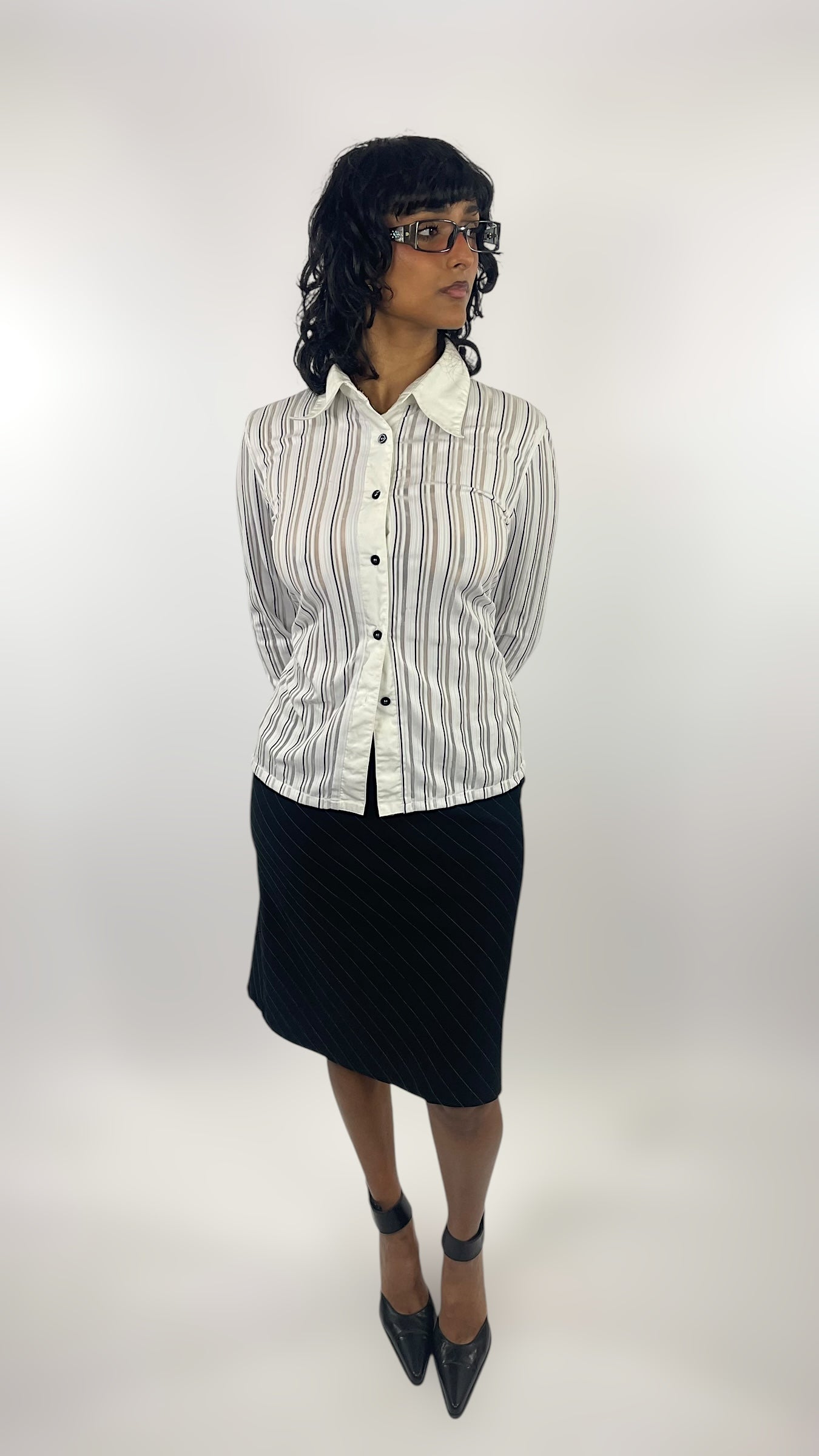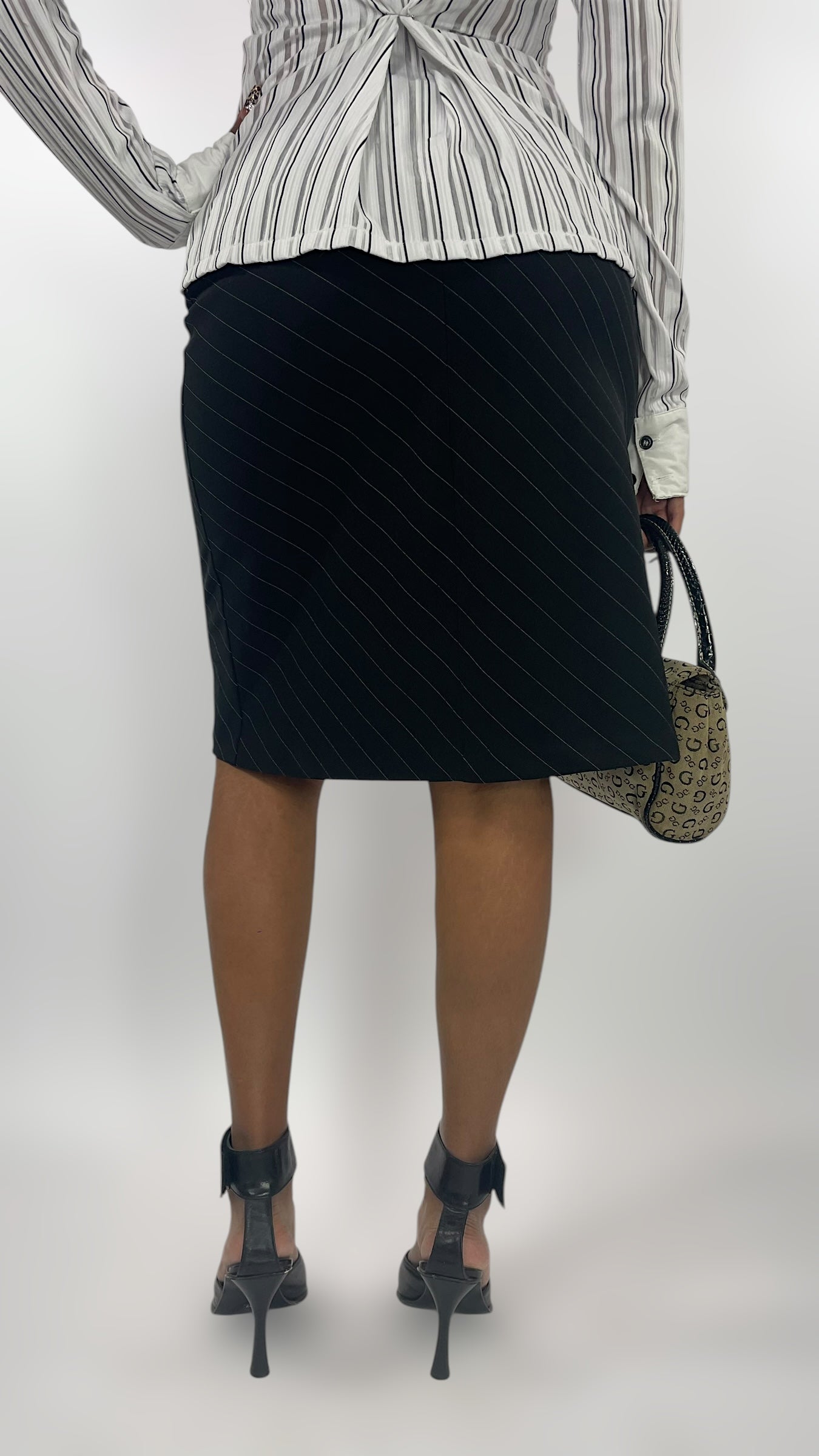 Jupe noire et blanche mi-longue à rayures diagonales.