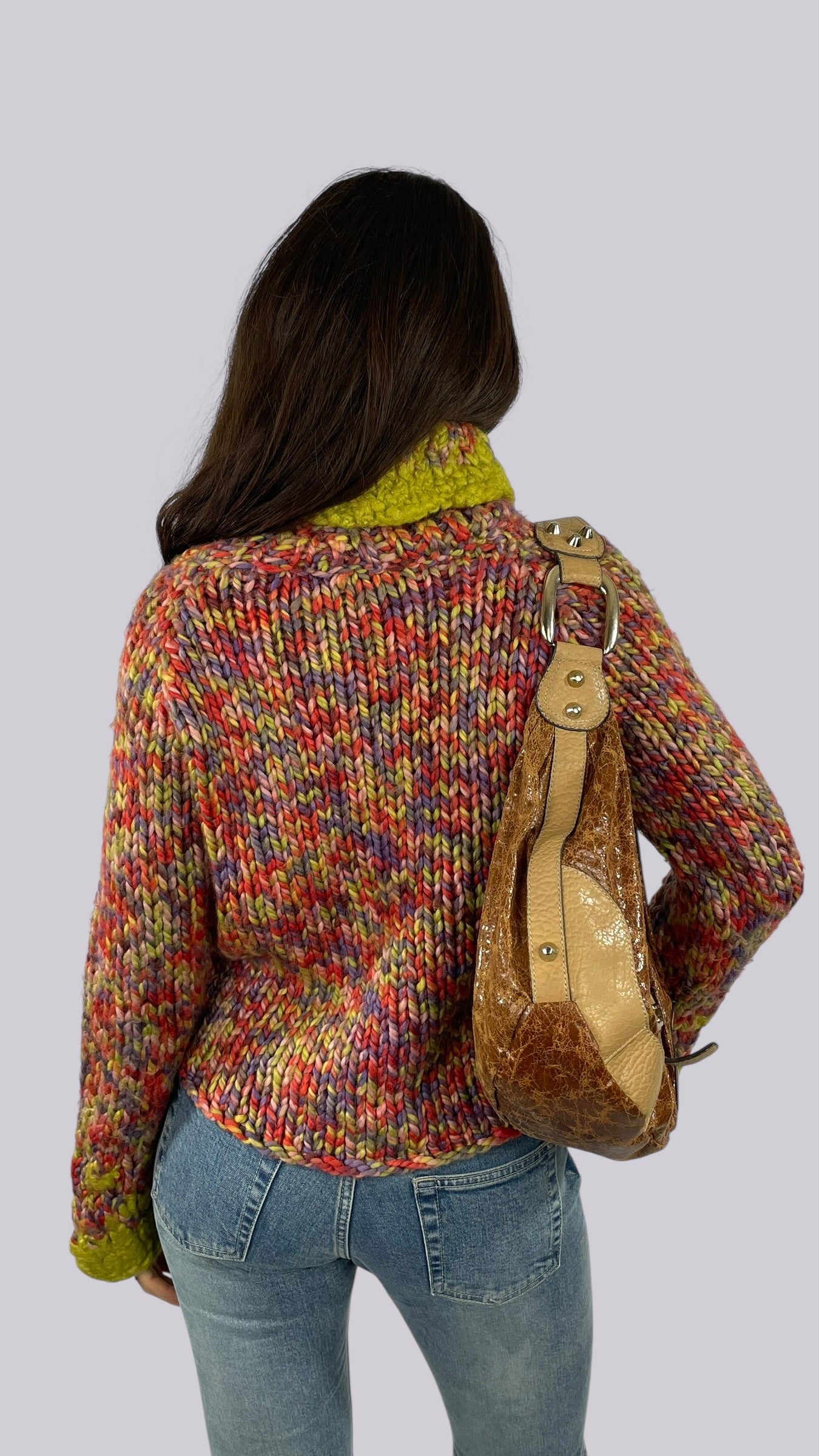 Pull multicolore en maille 100% laine vierge avec le col roulé et les manches évasées.