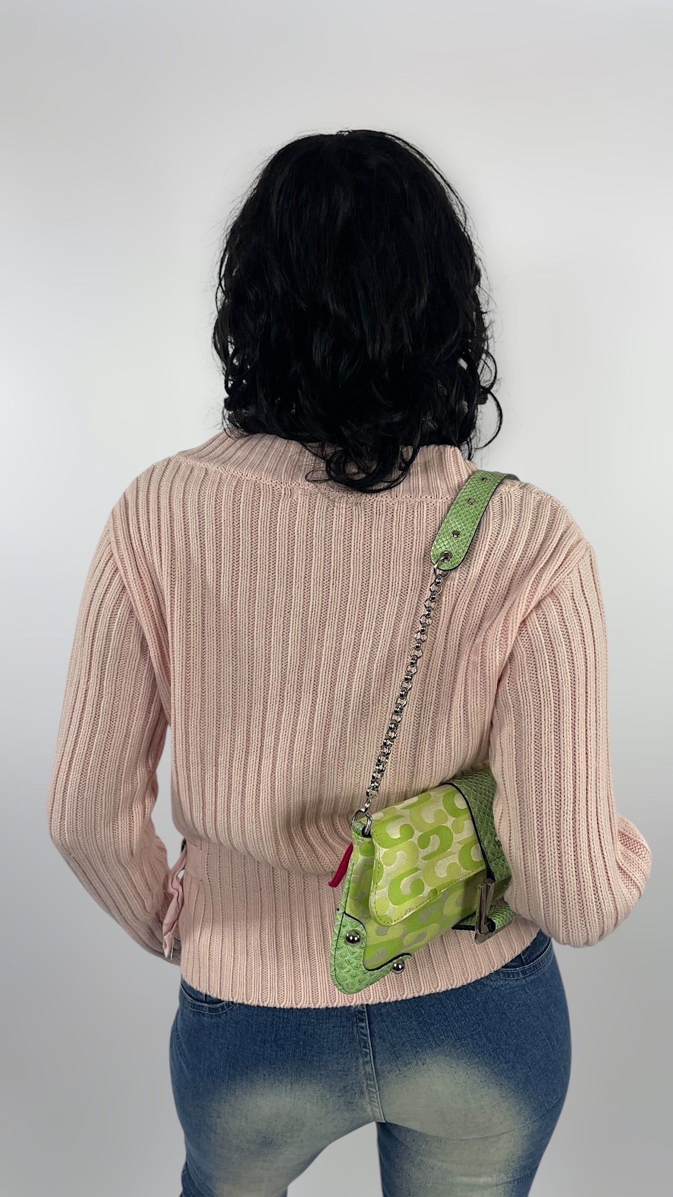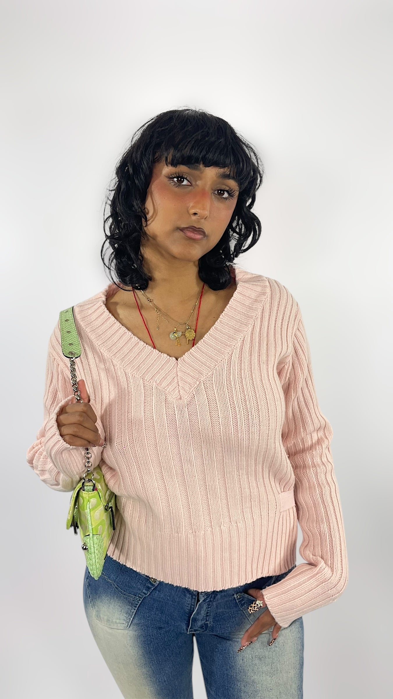 Pull rose pale en maille avec col V et des sangles avec boucles ajustables dans les côtes.
