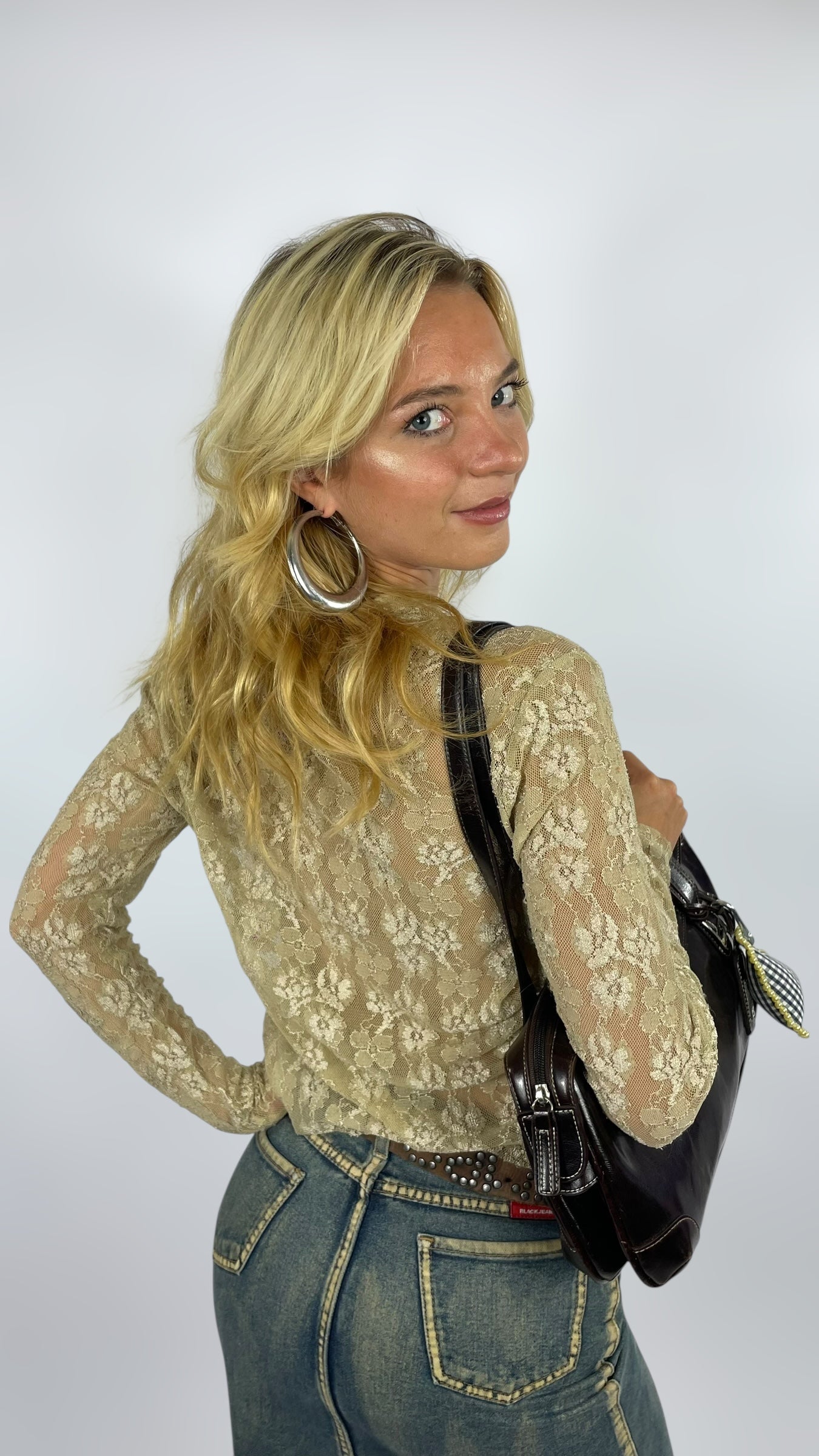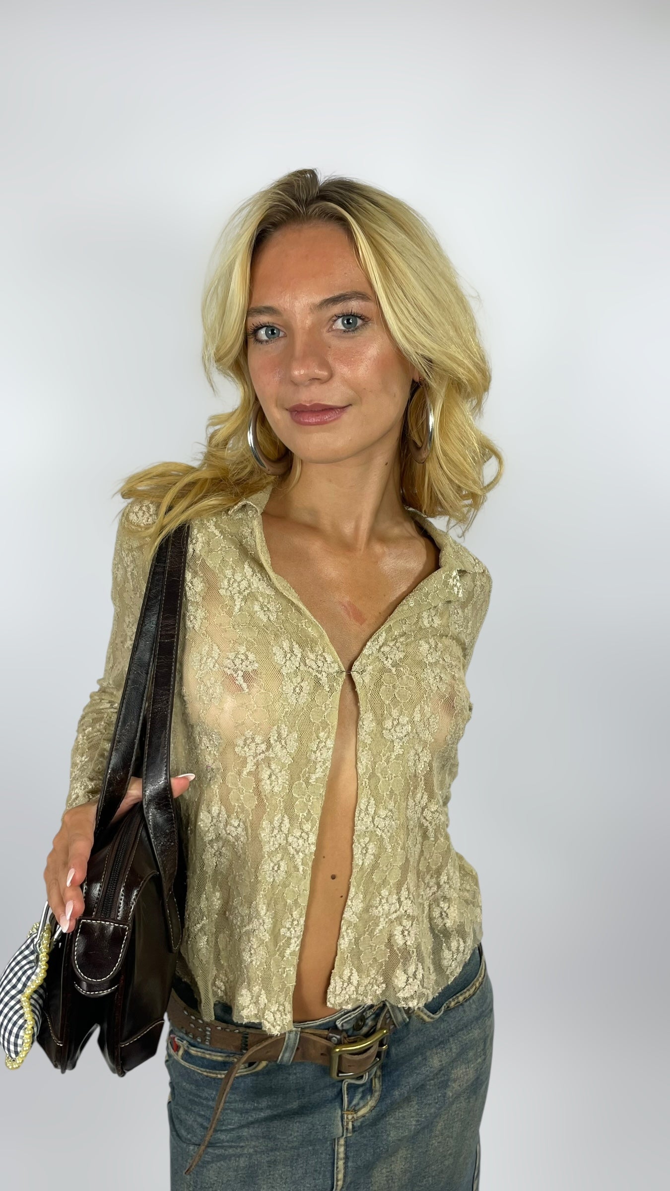 Top manche longue en dentelle beige à attacher devant avec une épingle à nourrice.