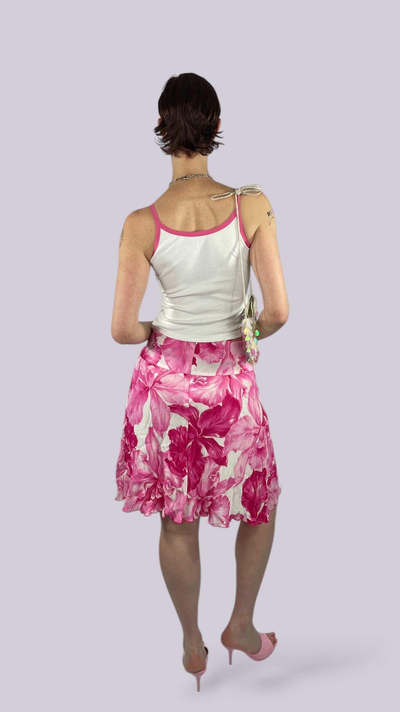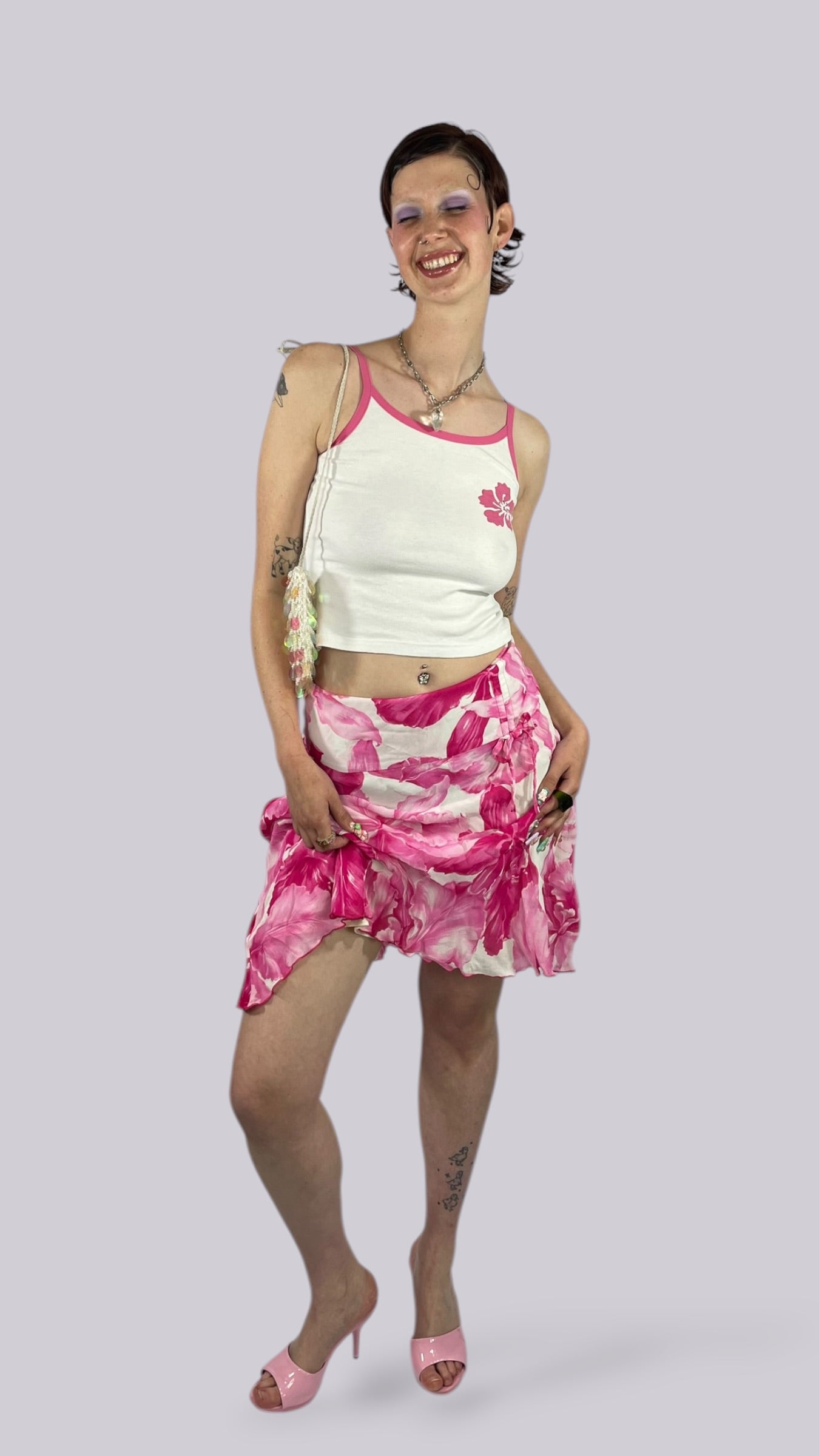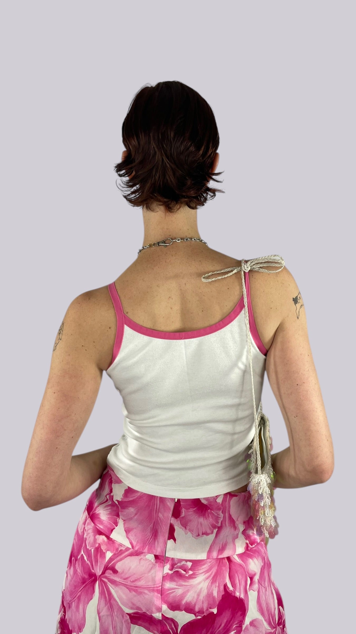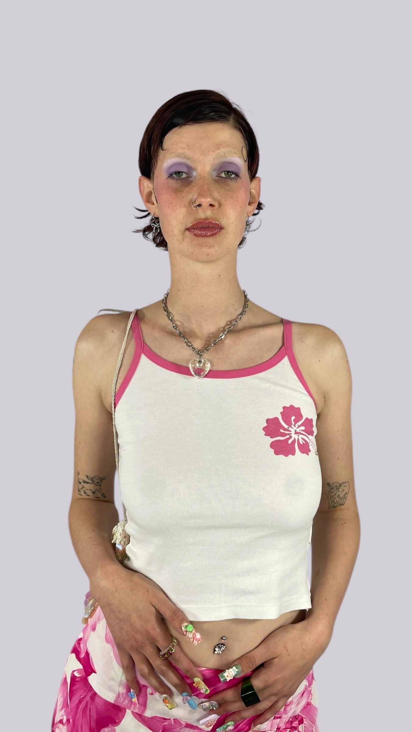 Débardeur blanc avec liserés roses et imprimé fleur ibiscus et strass sur la poitrine. Bretelles fines et coupe ajustée. Matière douce et légèrement stretch 100% coton.