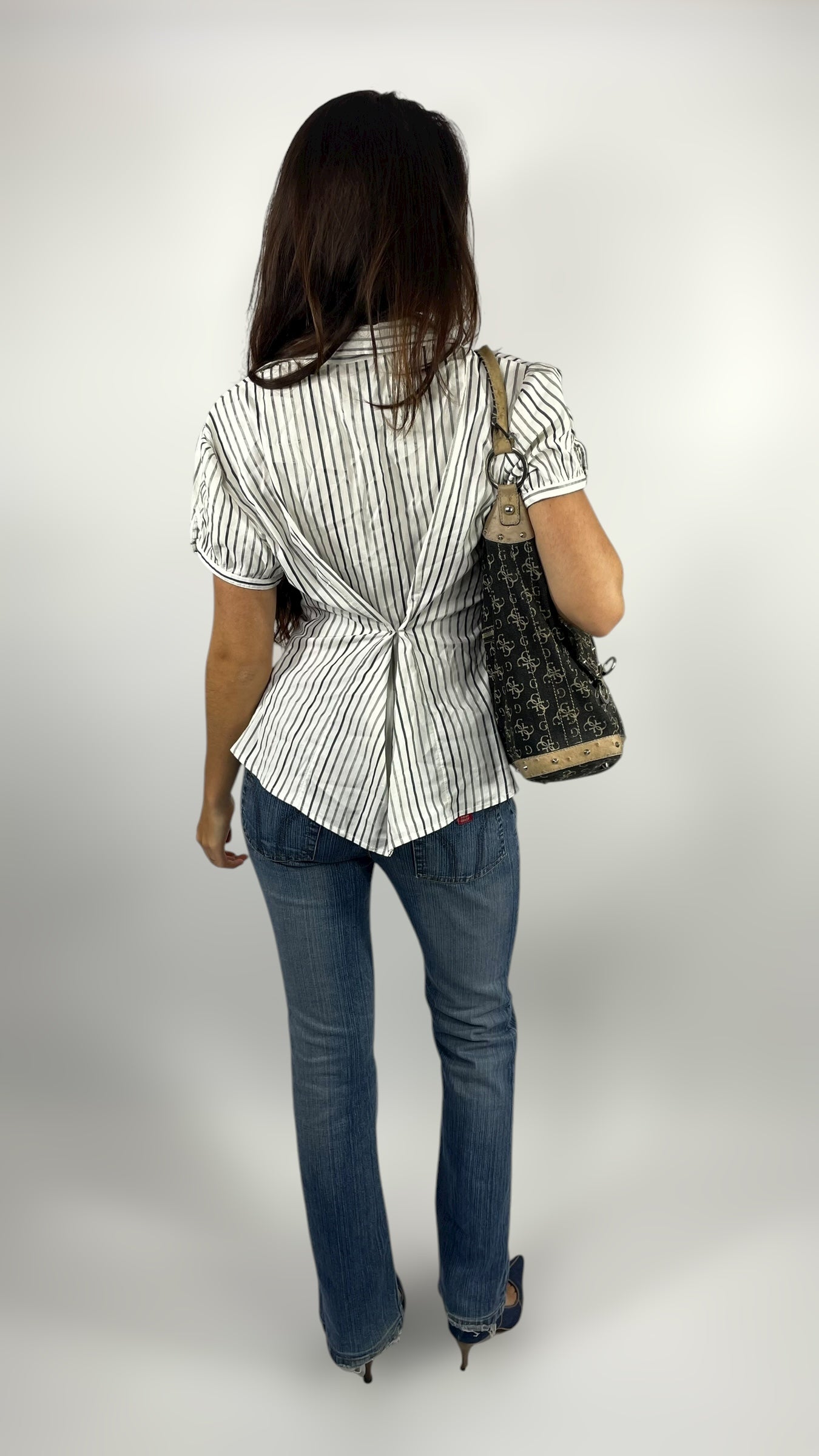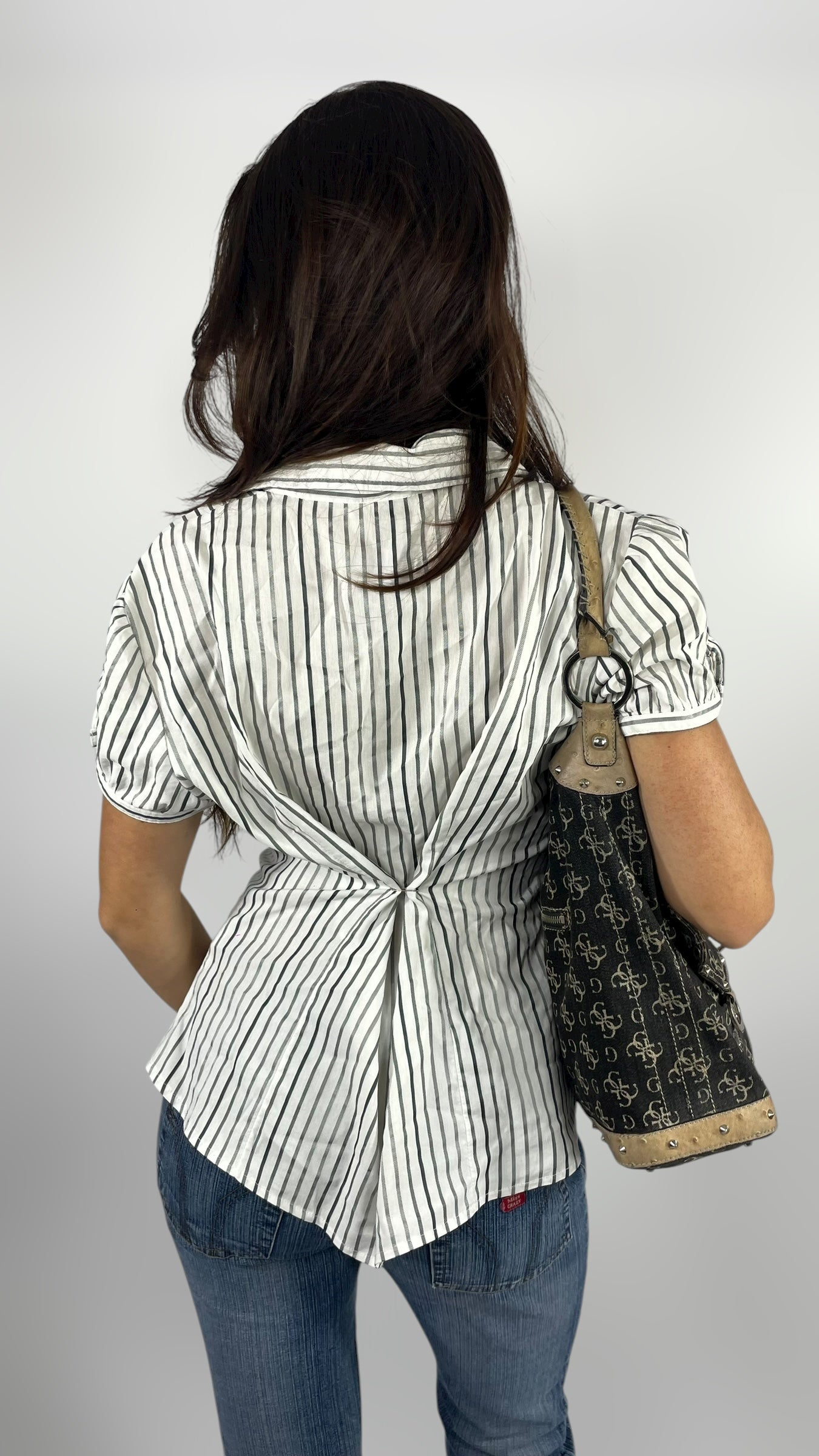 Chemise manche courte blanche à rayures grises, resserrée à l’arrière avec une épingle à nourrice pour les photos
