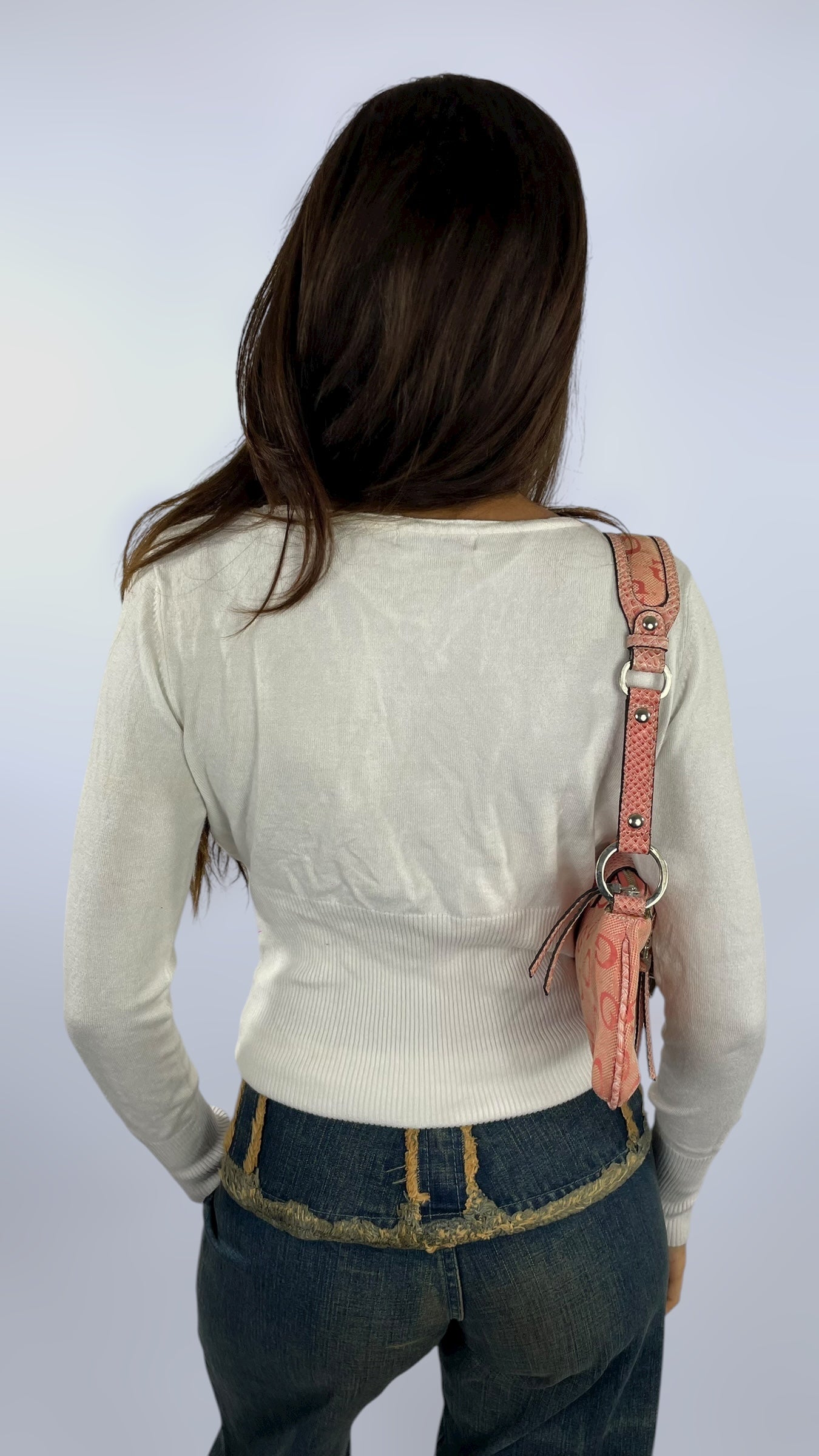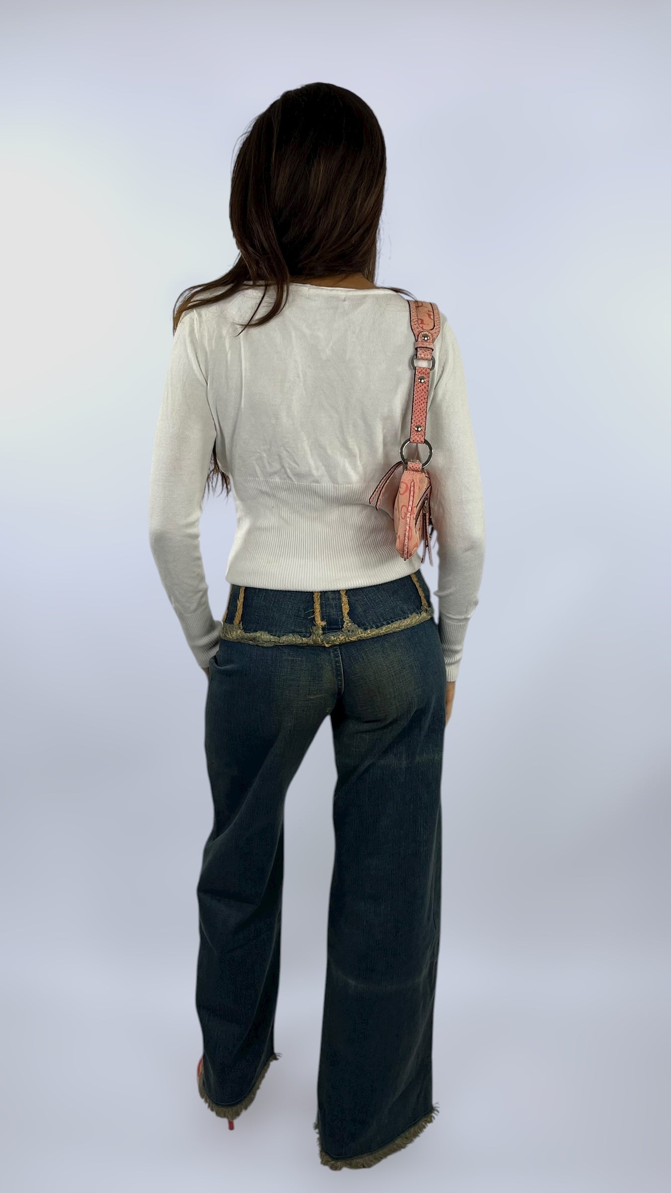 Top blanc décolleté en maille manches longues et serré à la taille.