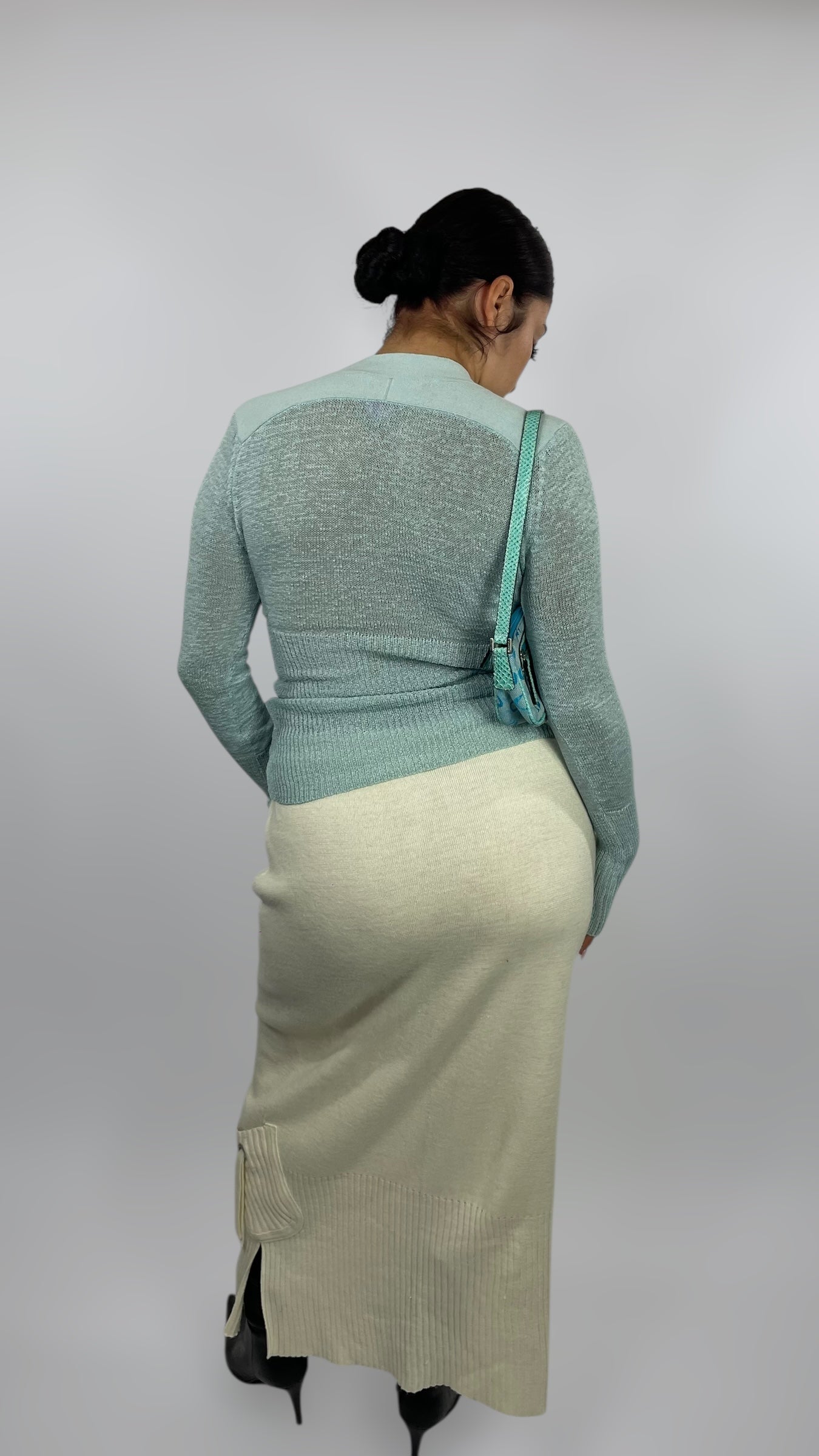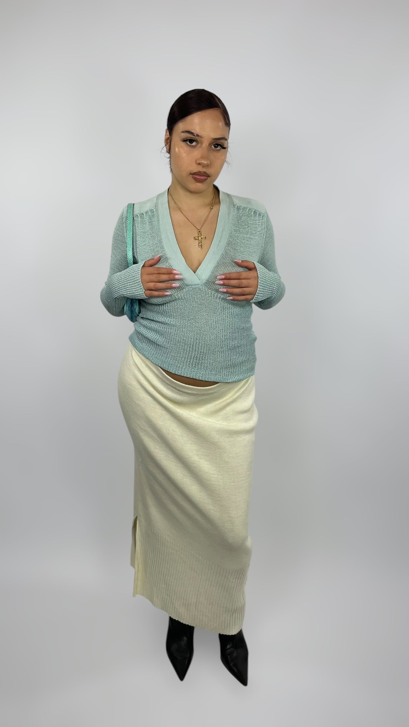 Haut bleu clair manches longues et col en V ajusté à la taille en maille côtelé un peu transparente. Très élastique.