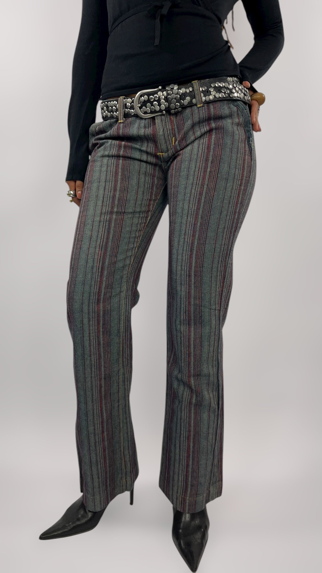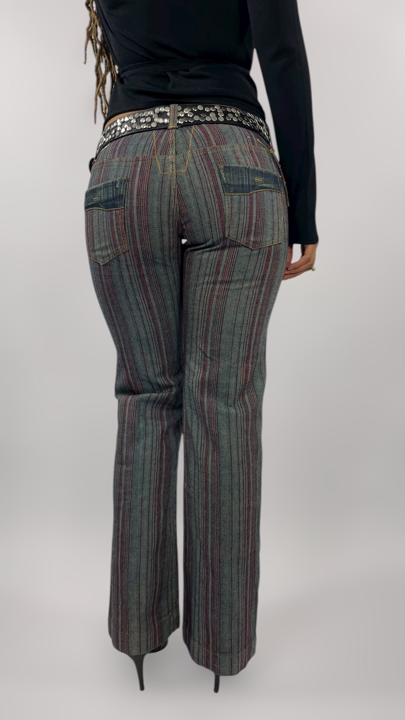 Pantalon y2k en jean à rayures rouges et noires, taille basse et coupe évasée.