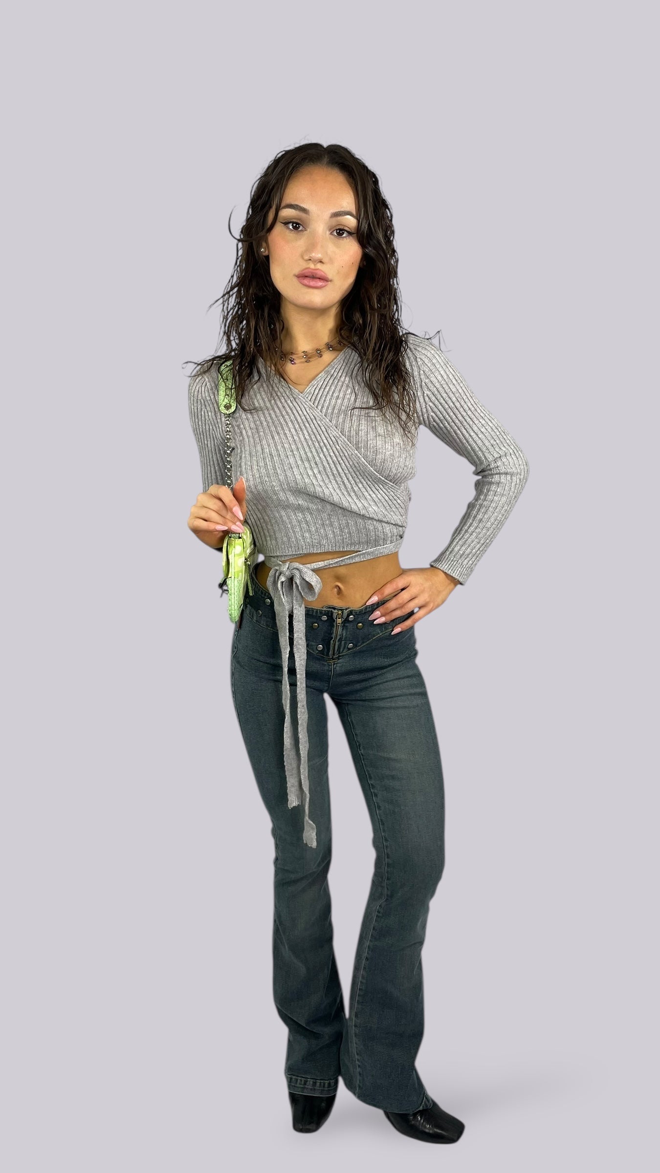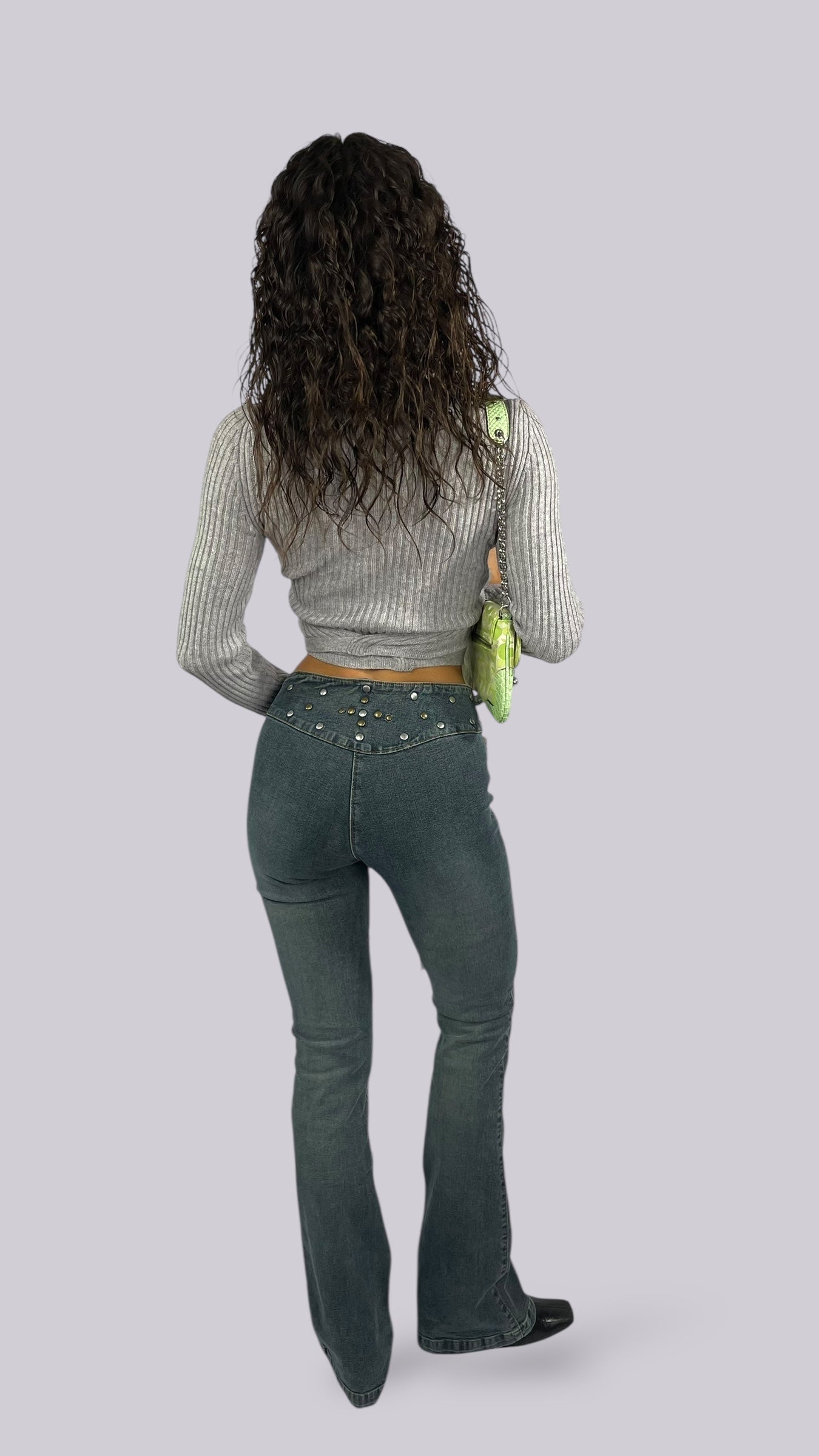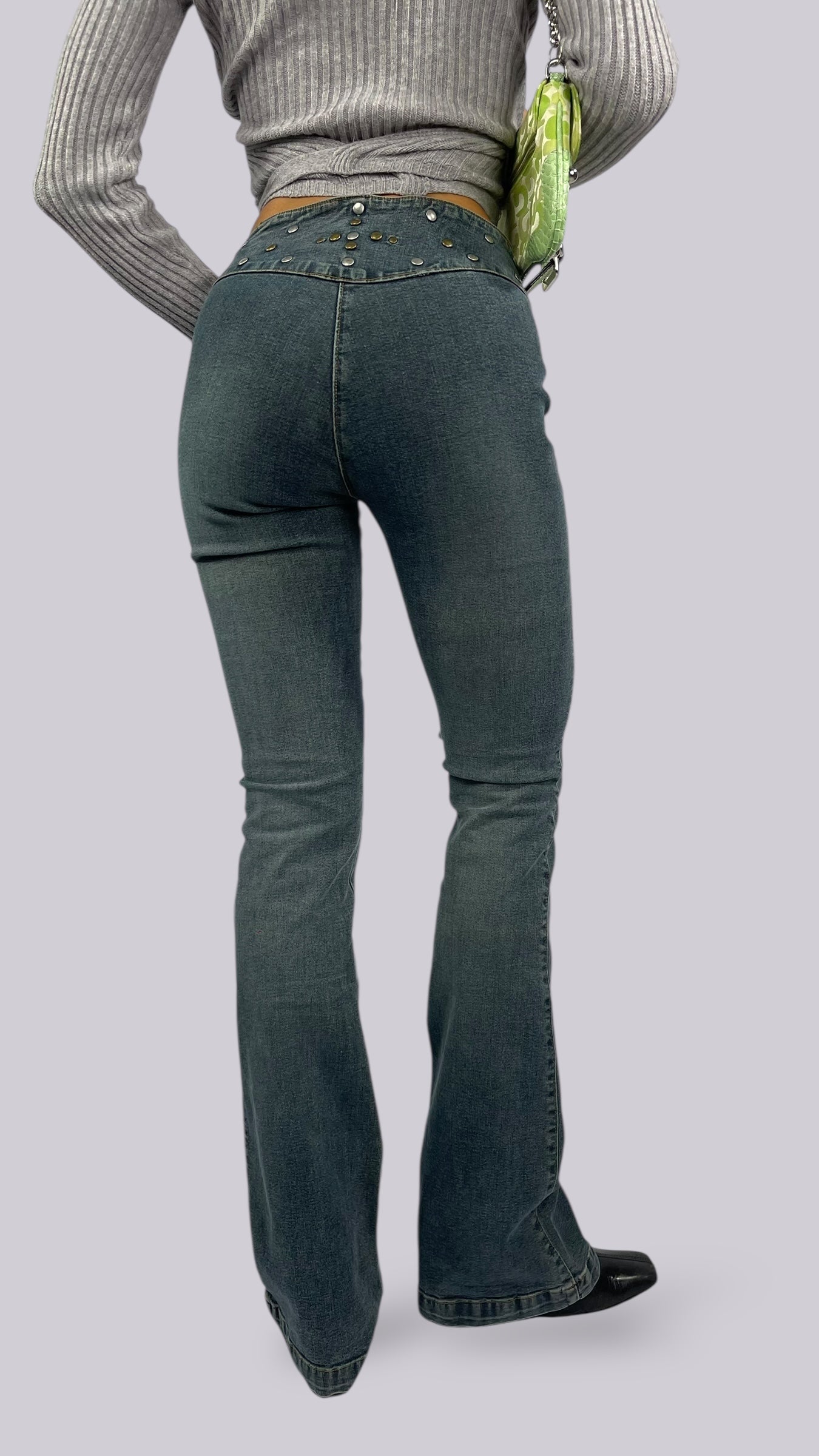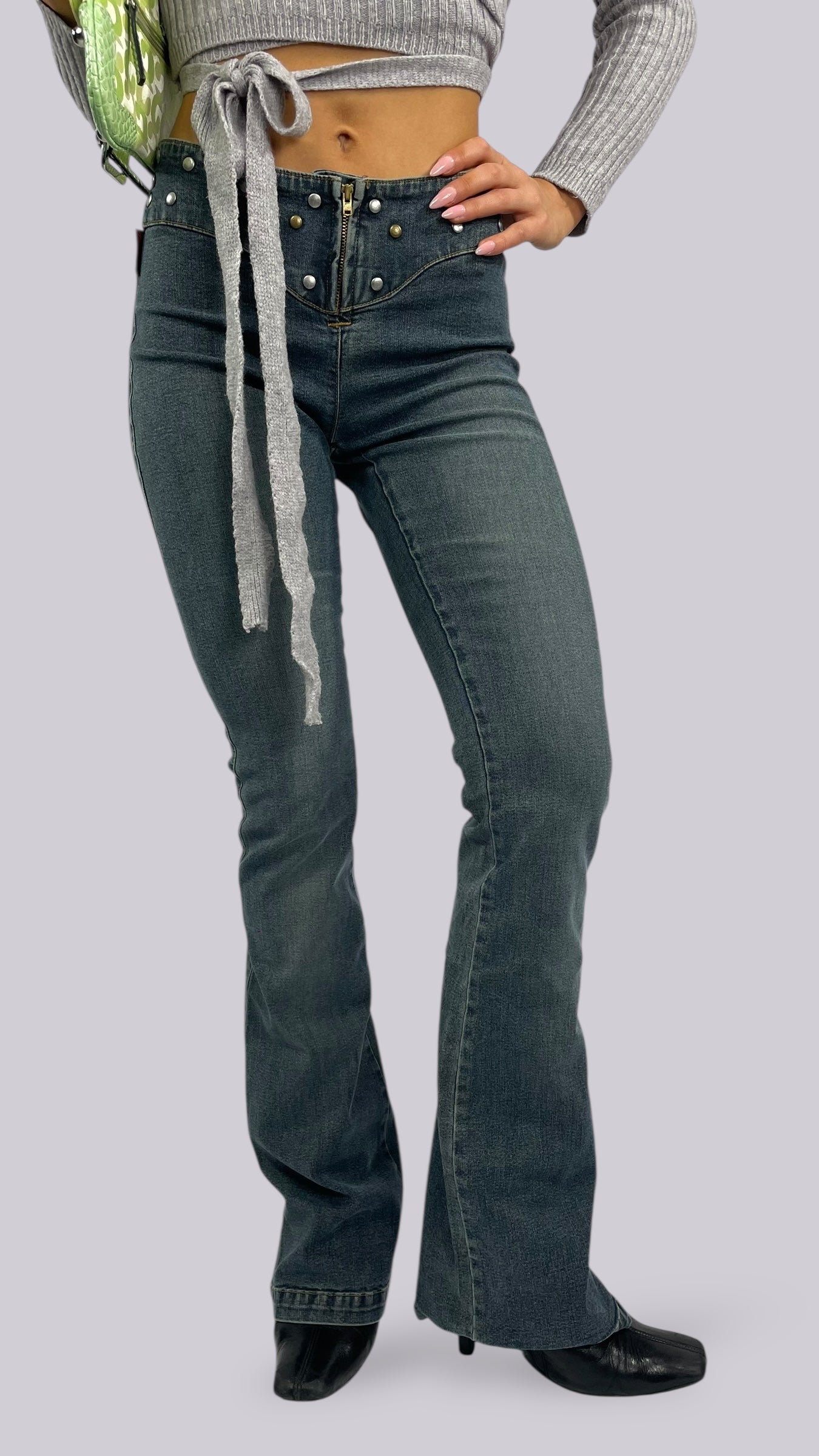 Jean y2k bleu foncé délavé taille basse et coupe évasée avec fermeture éclair à l’avant et clous décoratifs argenté et doré à la taille.