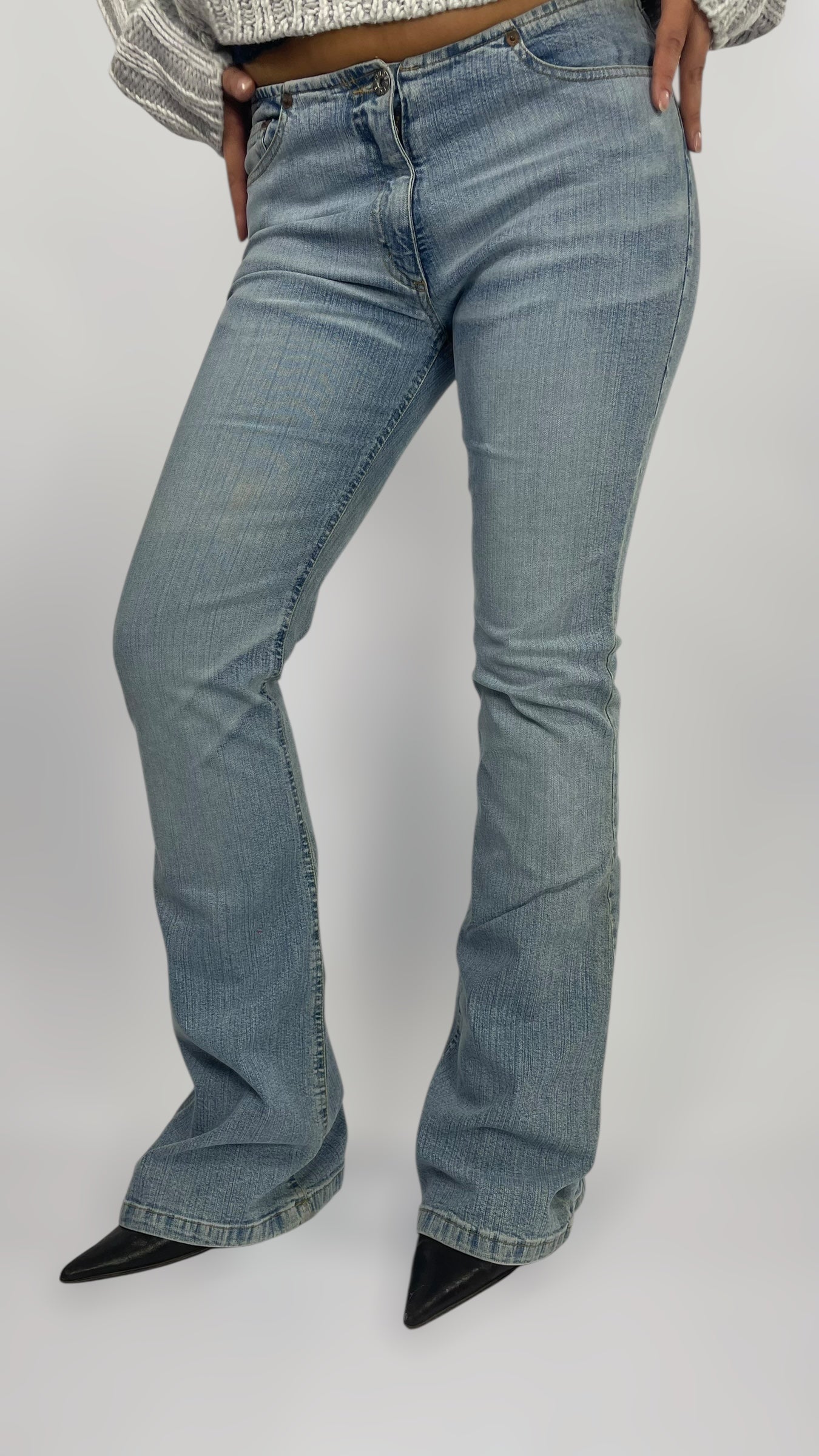 Jean bleu clair délavé coupe évasé taille bas. Tissu très élastique.