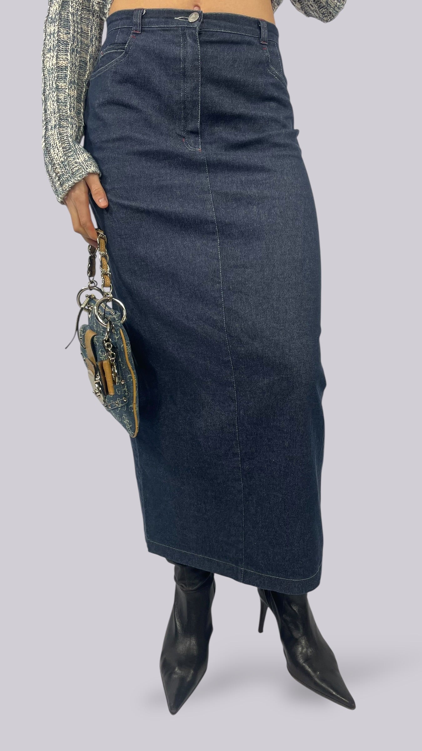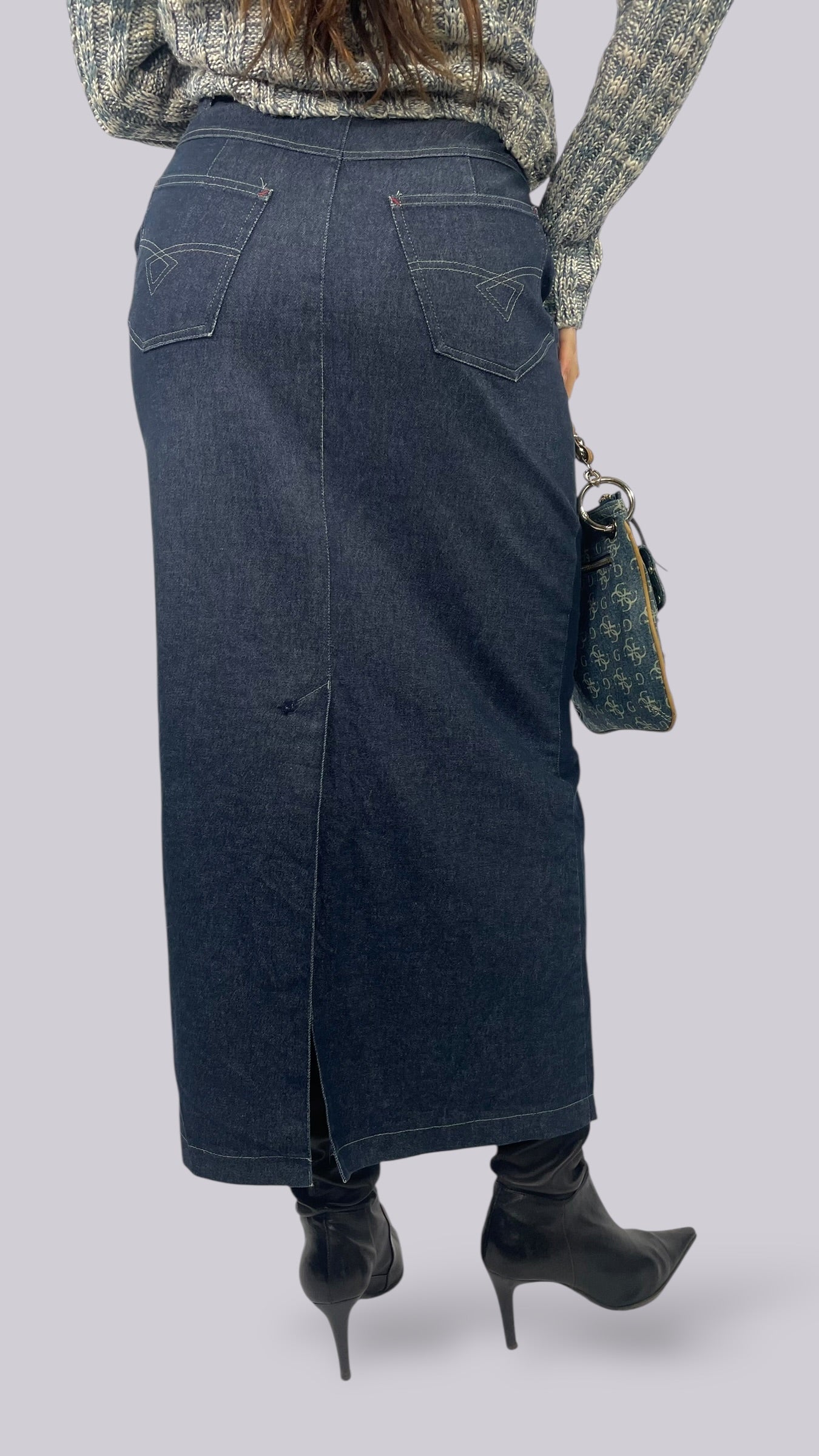 Jupe bleue foncée longue en jean coupe droite. Matière très élastique.