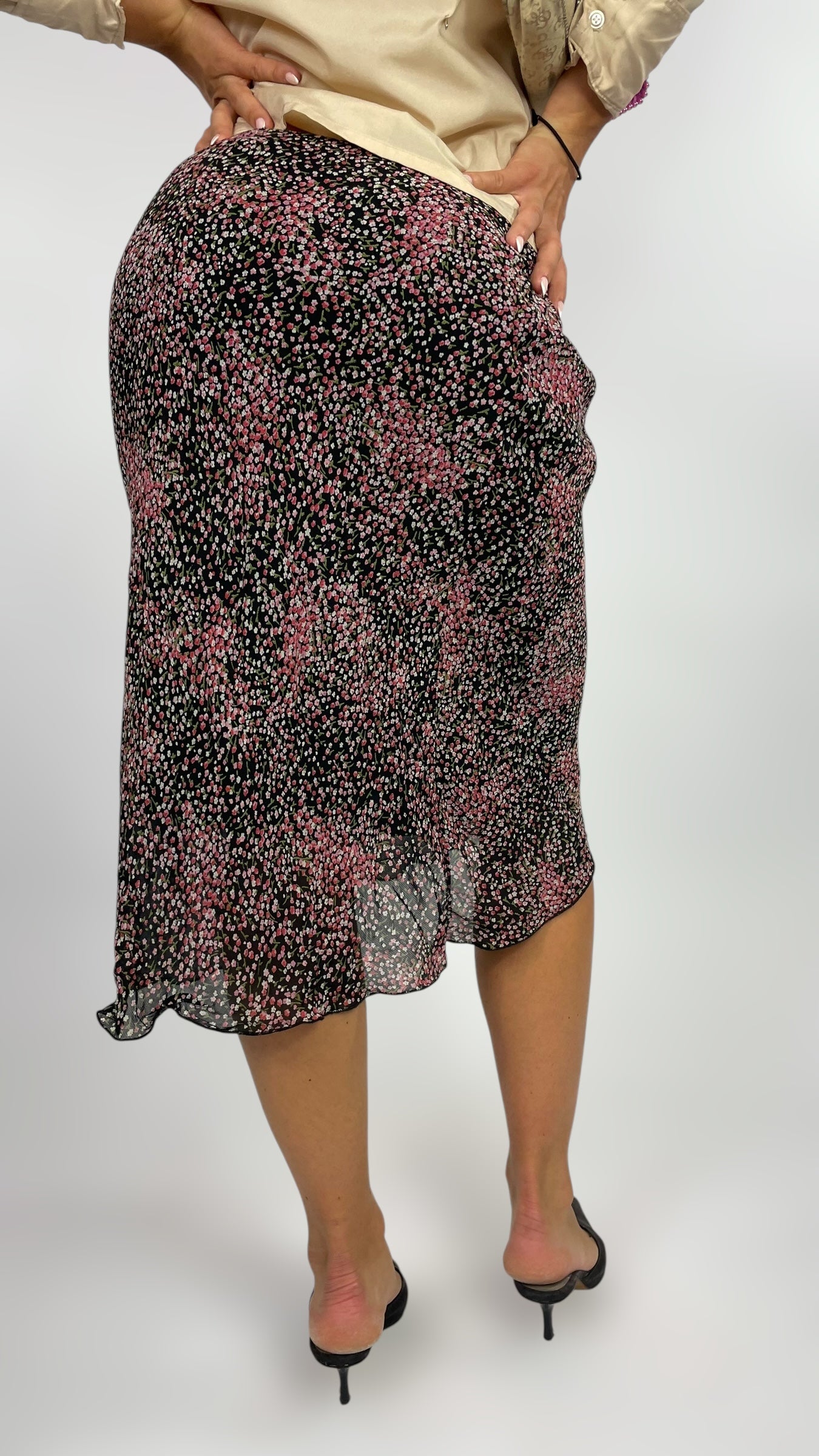 Jupe midi fleurs roses sur fond noir, matière mesh doublé.