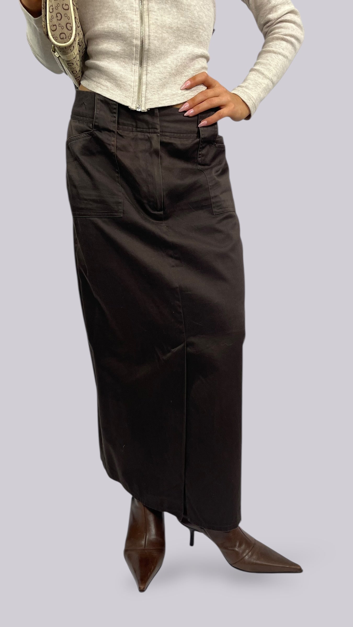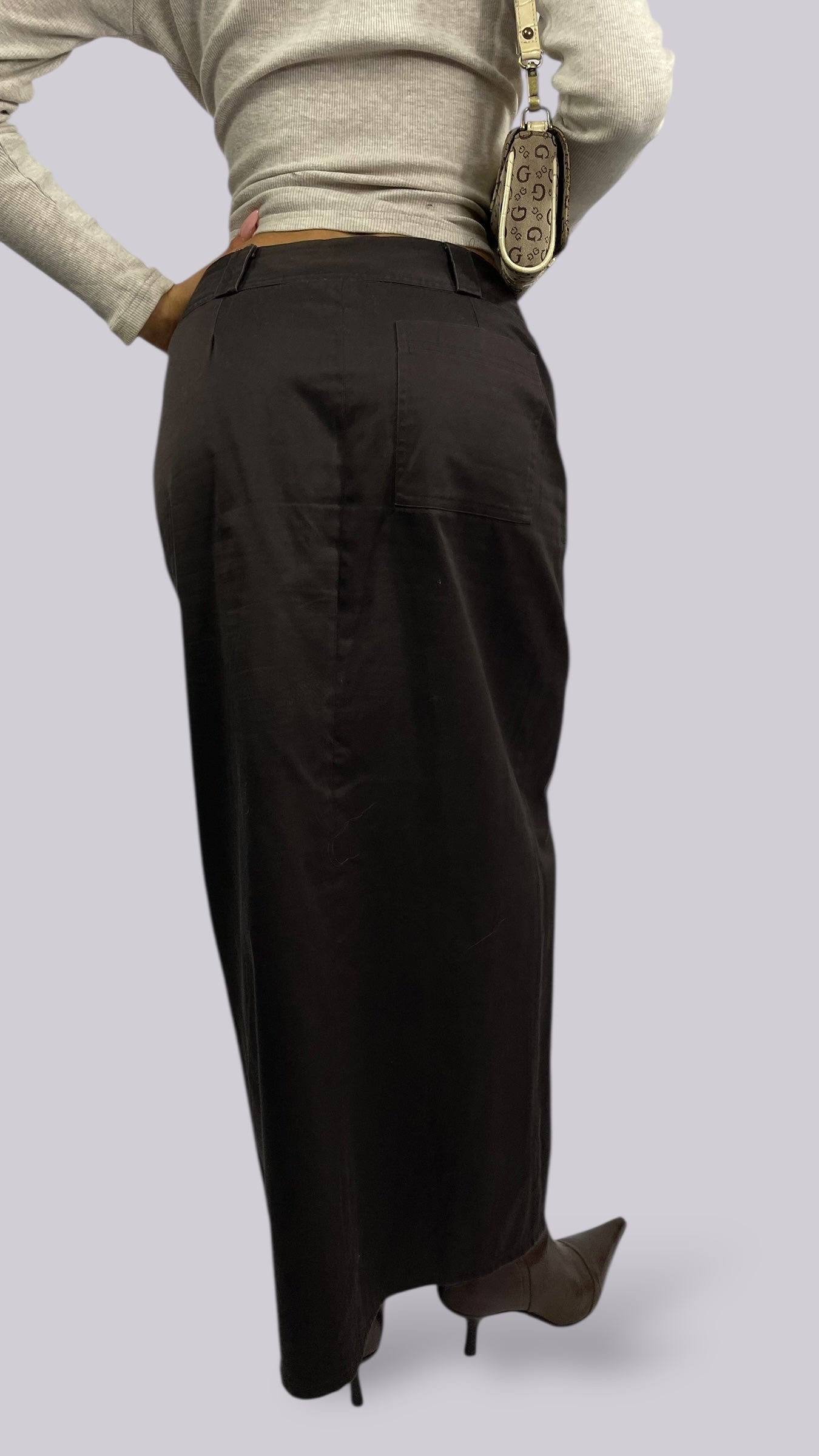 Jupe marron longue type costume avec fente à l’avant.
