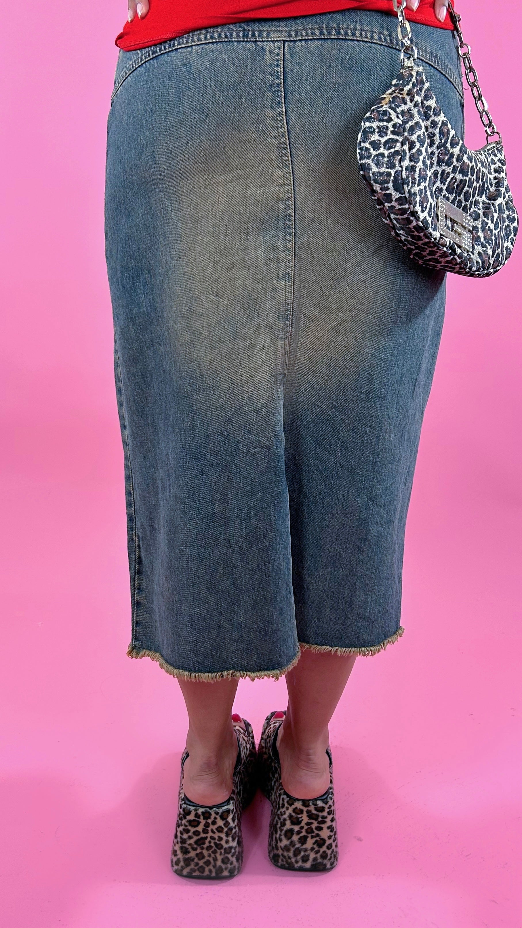 Jupe mi longue en jean effet usé avec ouverture derrière.