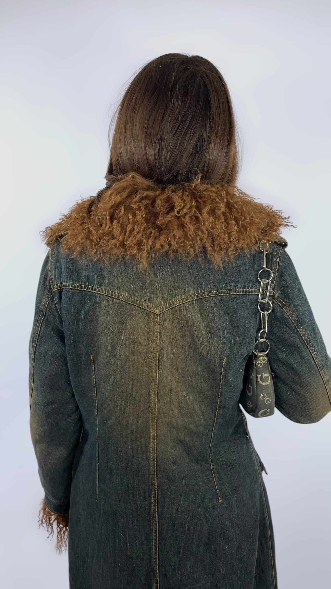 Manteau Afghan long en jean délavé avec vrai fourrure marron au manches et col.