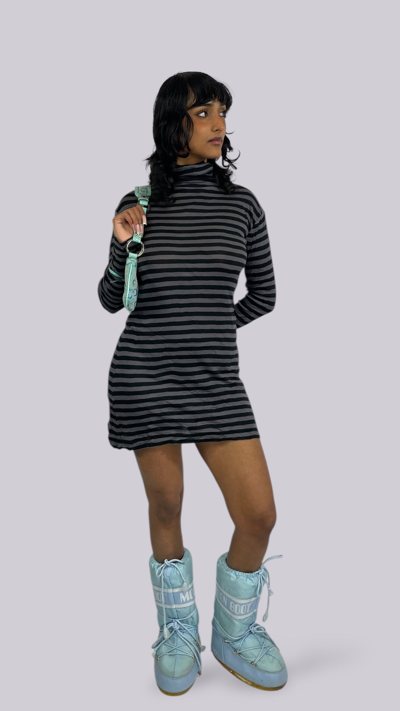 Robe grise et noire manches longues avec col roulé et motif à rayures. Elle est très élastique.