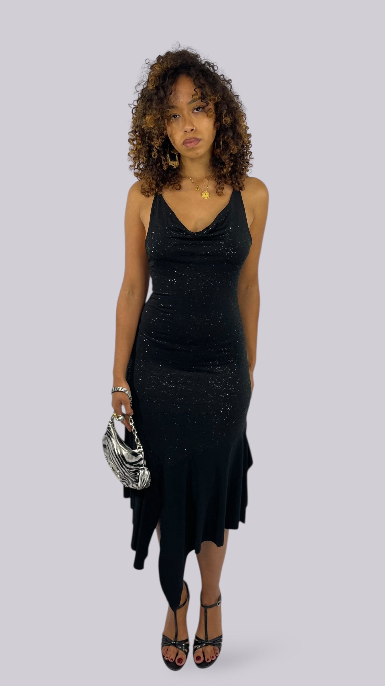 Robe noire à paillettes mi-longue col bénitier drapée et dos croisé avec volants.