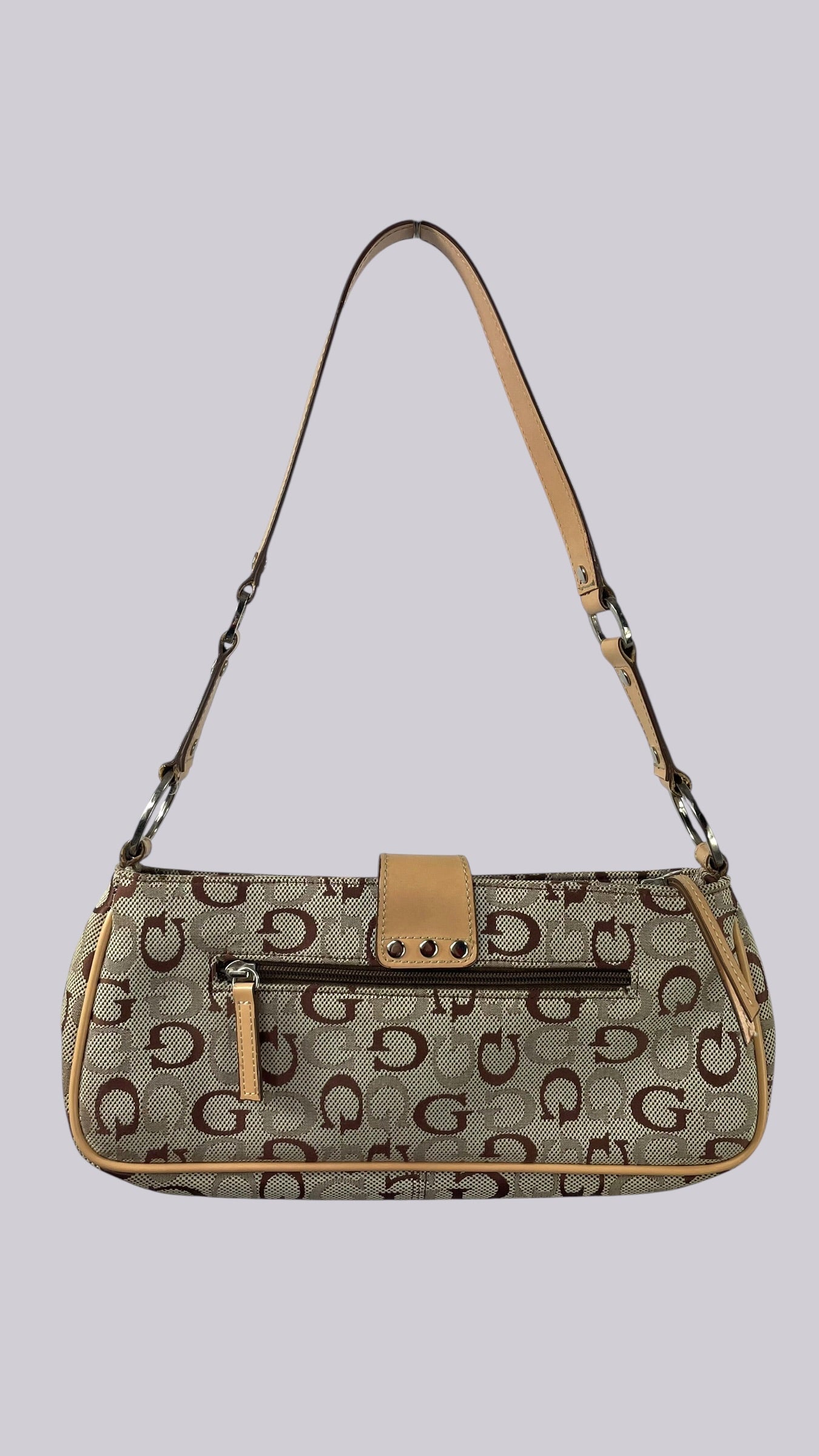 Sac Guess Vintage beige et marron à monogramme avec boucle et anse en similicuir beige.