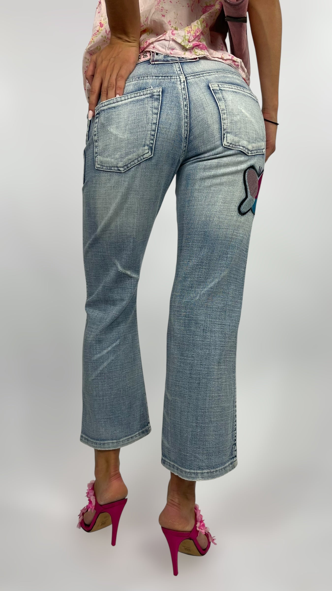 Capri en jean clair avec détails brodés papillons