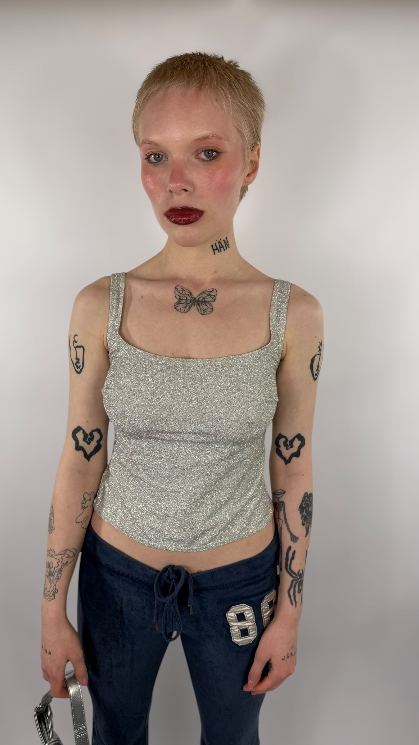 Top court gris argenté brillant, élastique