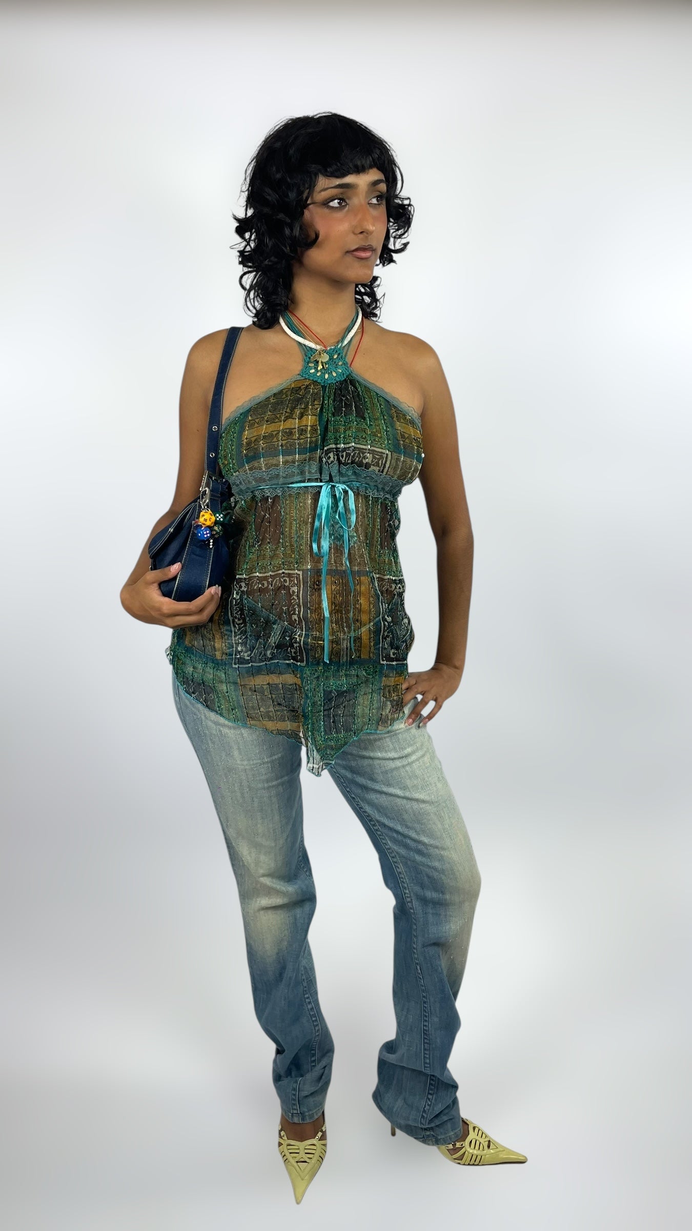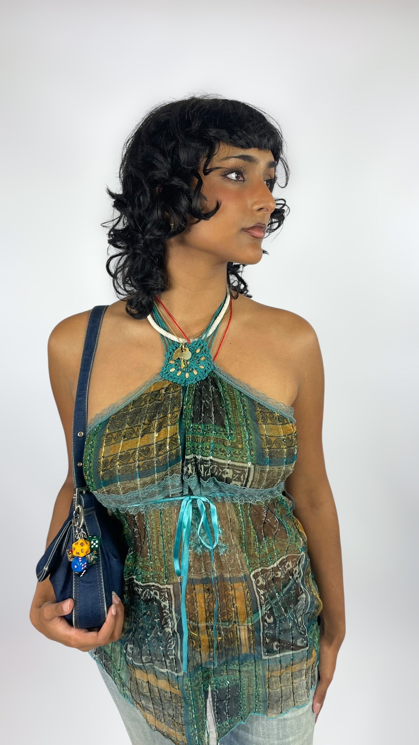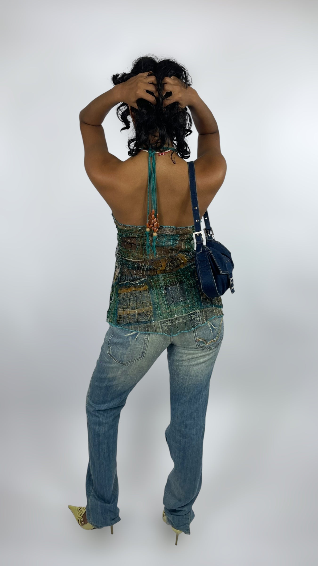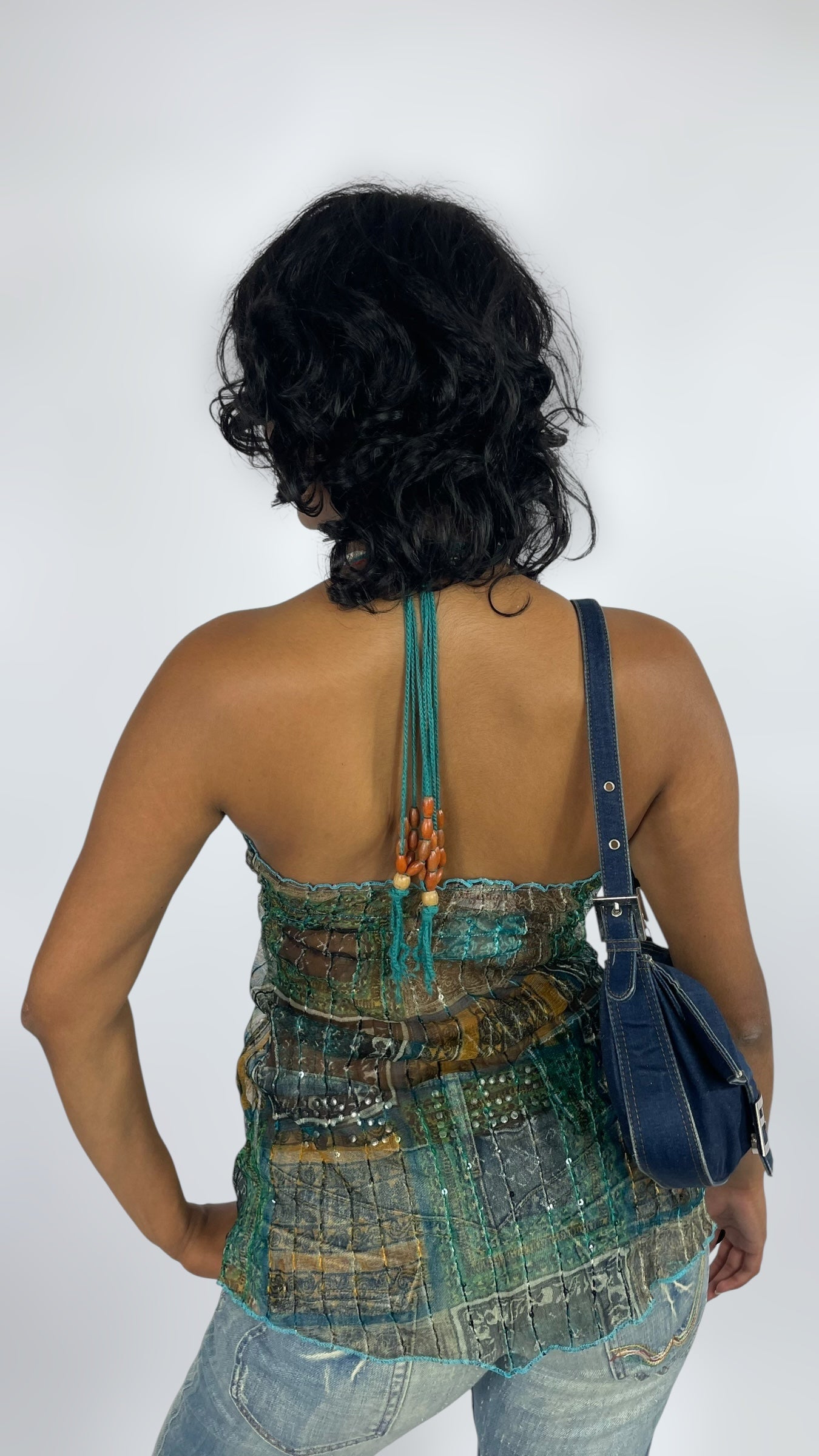 Top dos nu en mesh transparente, doublée au niveau de la poitrine. Lien pour nouer à l’arrière avec perles en bois.