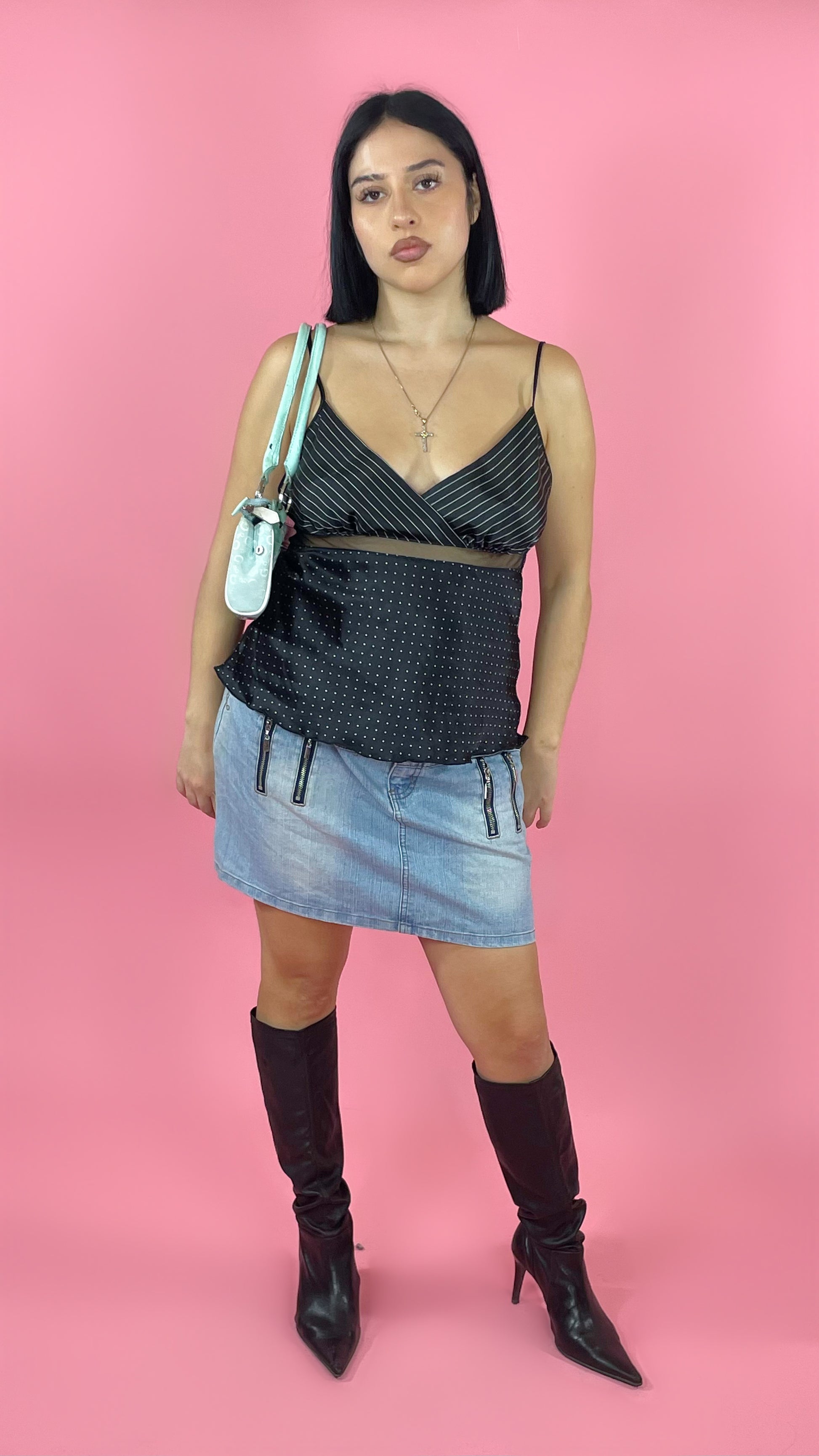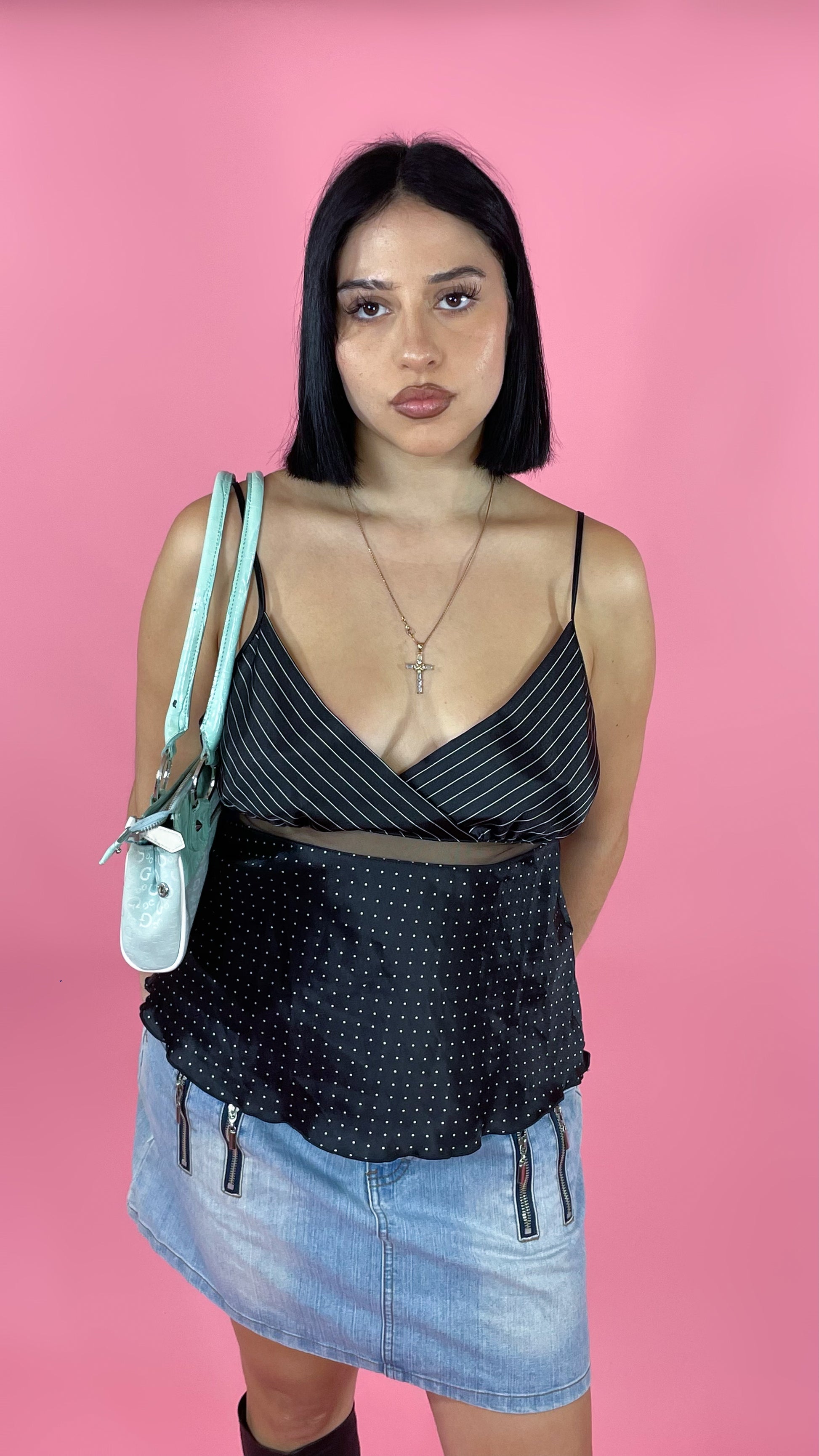Top satin lingerie noir à motif blanc.