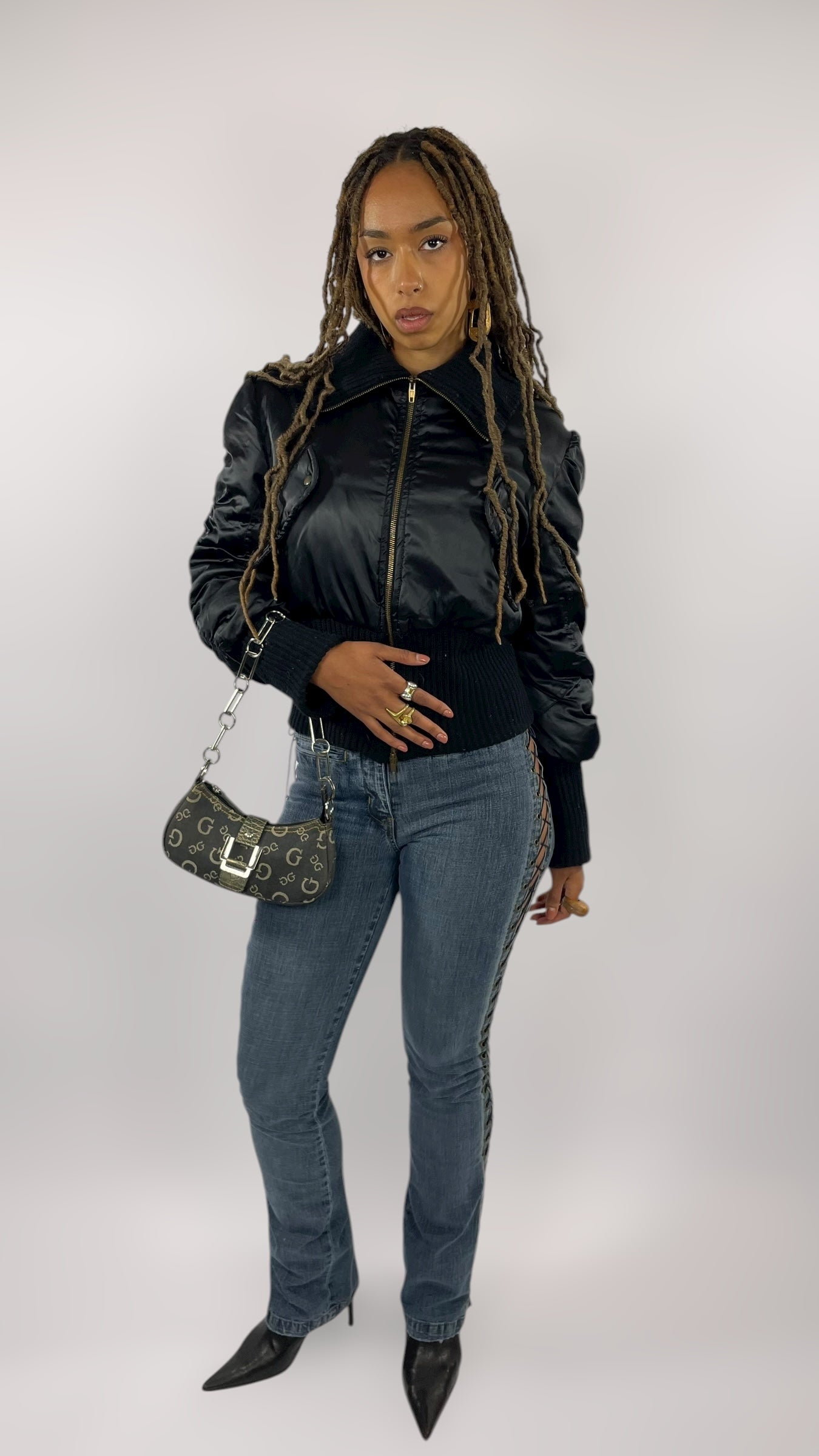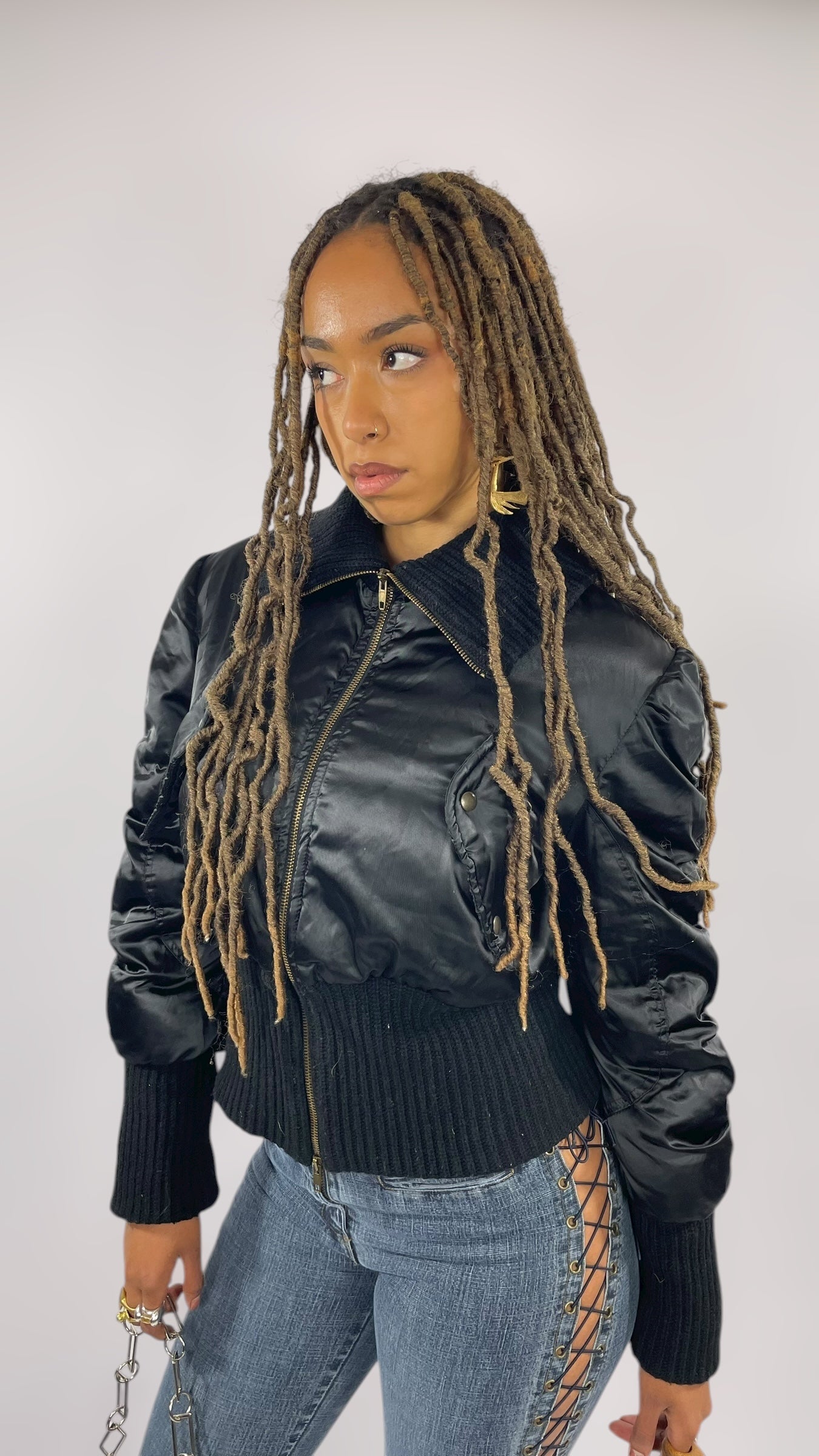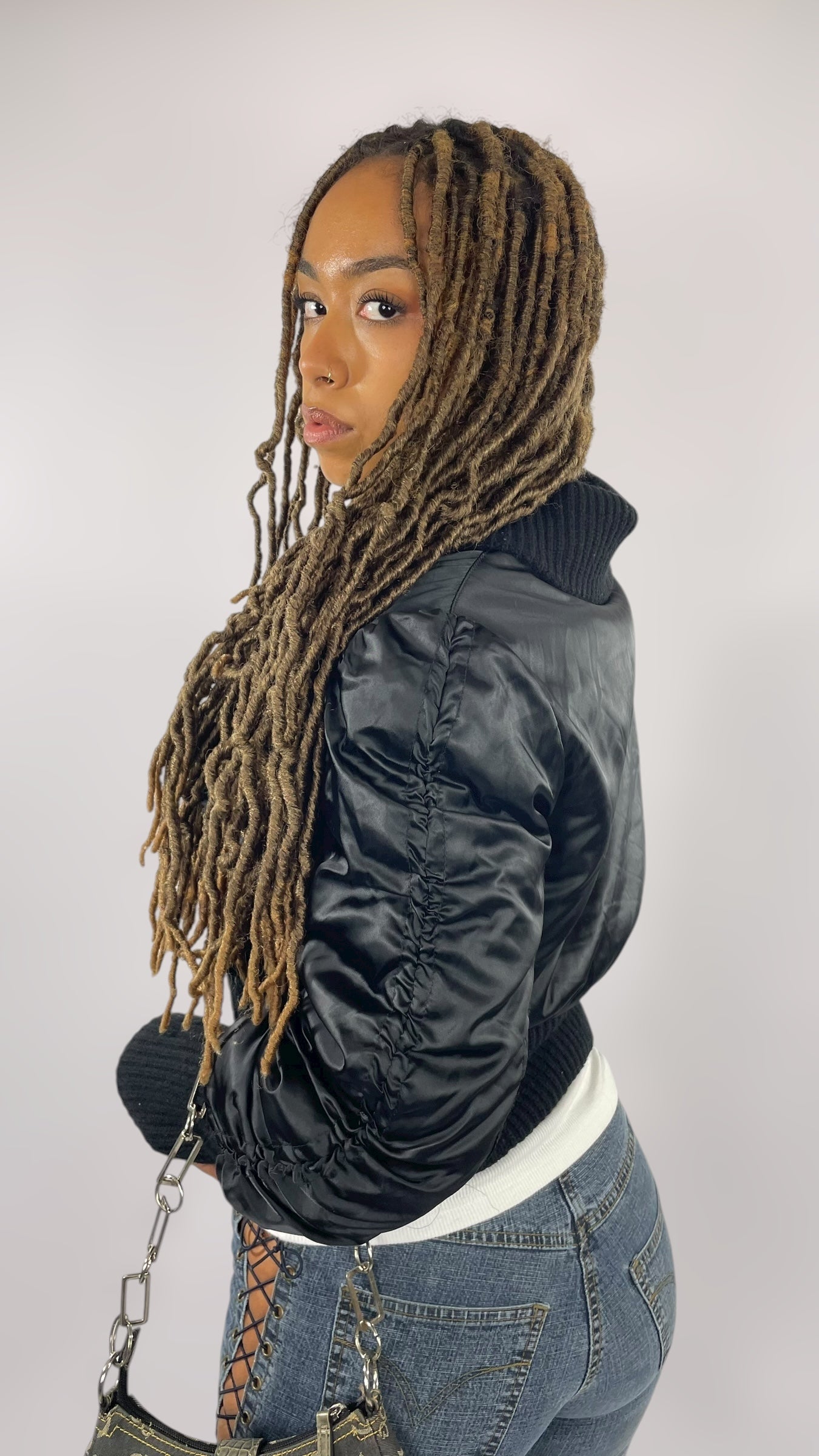 Veste noire courte style bomber bi-matière ajusté à la taille avec col montant, froissé au manches et fermeture éclair.